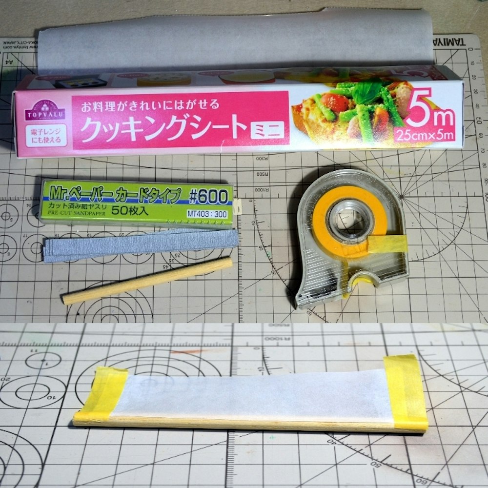 心棒には、クッキングシートを巻き付けます。紙やすりで表面で荒らしておくとマスキングテープが付きやすくなります。