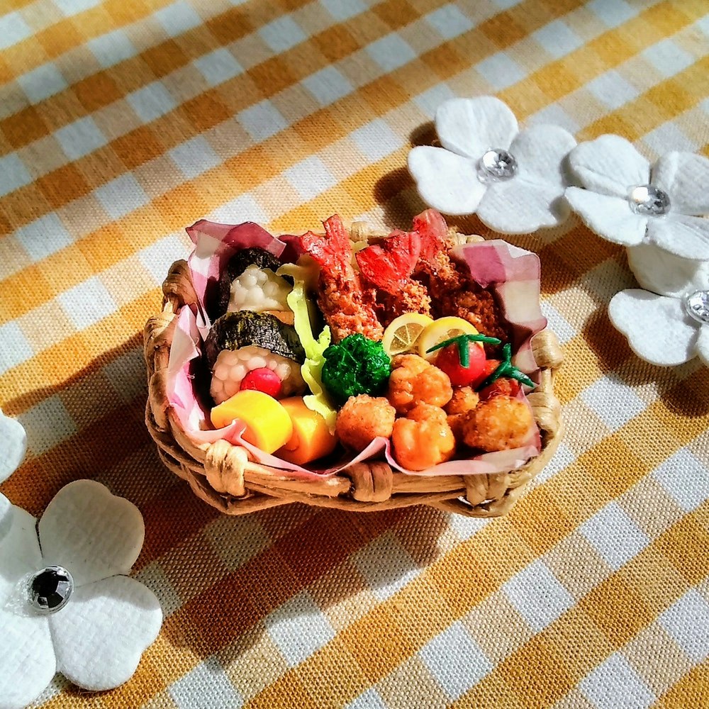 お馴染みのお弁当のおかずが約25ミリのピクニック弁当にたくさん詰められています。