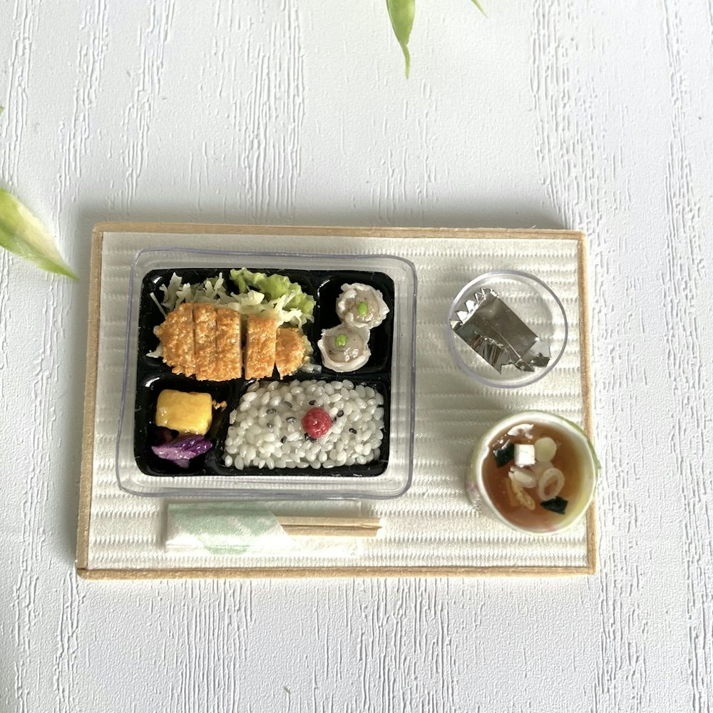 食材の一つ一つもものすごくリアルなのですが、お弁当容器や付属のお味噌汁のカップ、割り箸なども本物そっくりです。