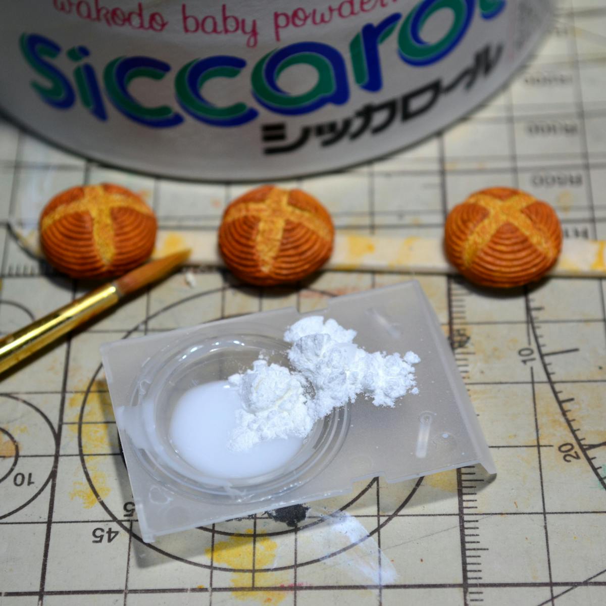 シッカロールは水に溶いても溶け出さず、乾くと白く戻るので、小麦粉や粉砂糖の表現には良いですね。