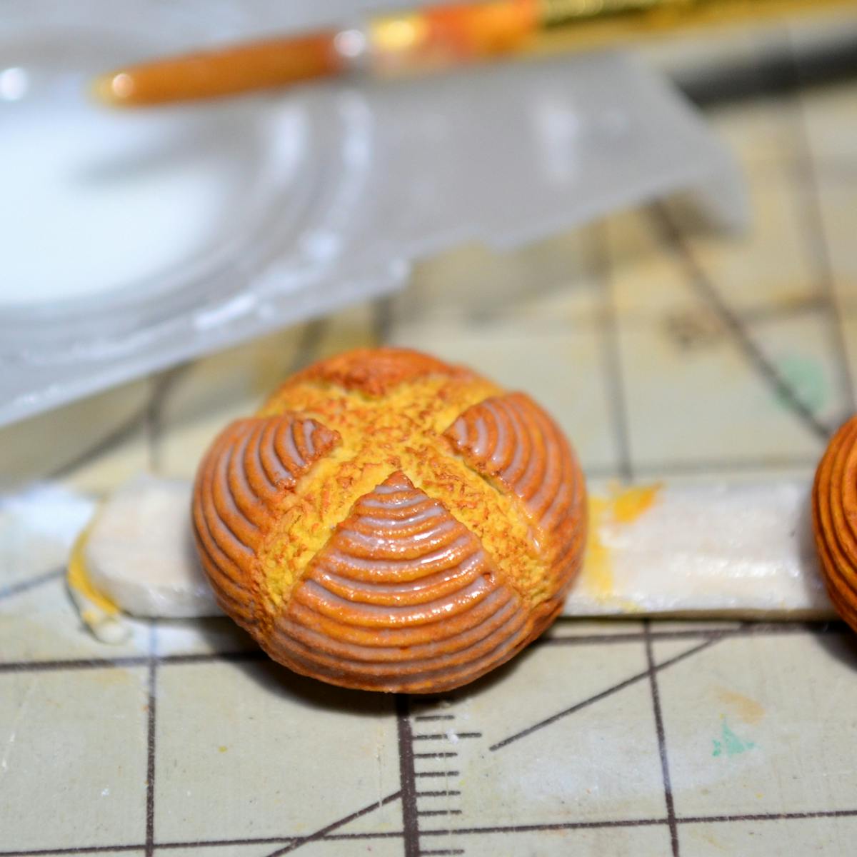 パンドカンパーニュもほかのパンと同様に、日本ミニチュアフード協会オリジナル絵の具のパンの生地色、ふんわり焼き色、しいたけブラウンで塗っています。