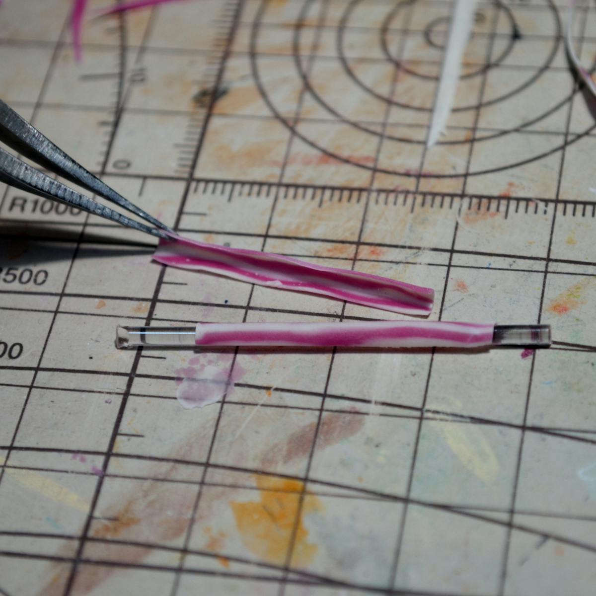 細く伸ばした粘土の上に、木工用ボンドで順番に接着していきます。