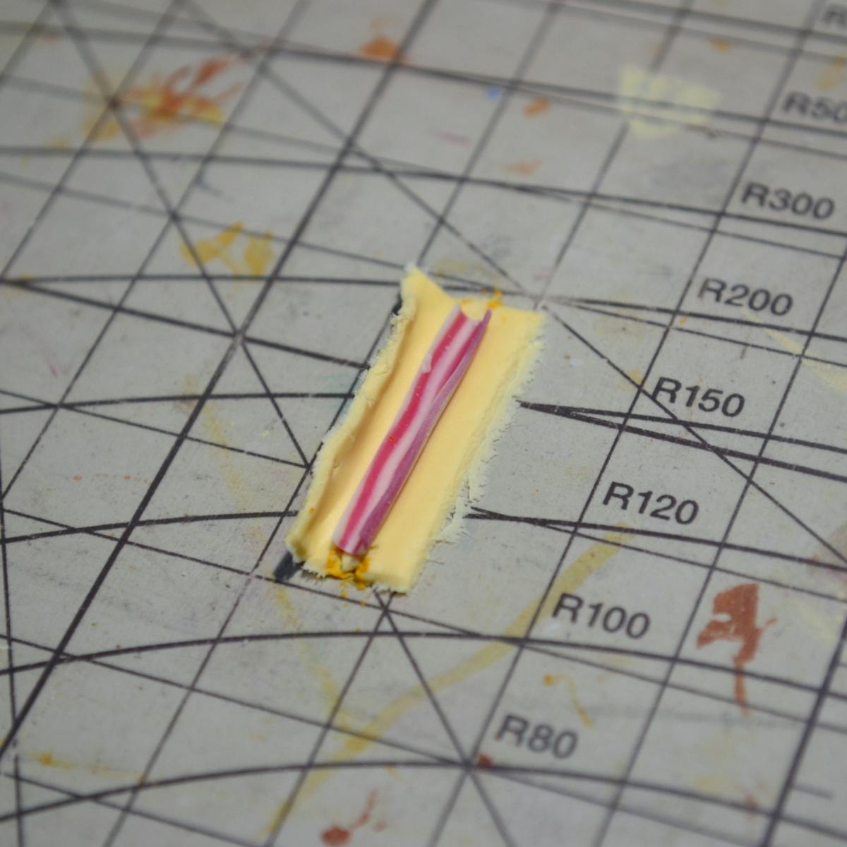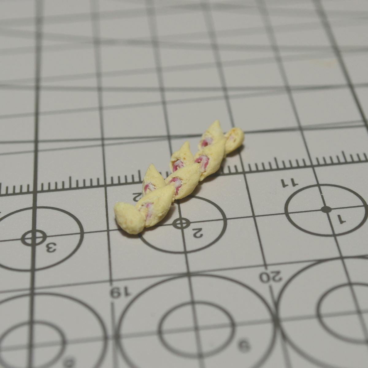 そこで、写真の様に、タミヤの2mmの透明プラ棒に巻き付けて粘土で作ったベーコンに丸みをつけておきました。