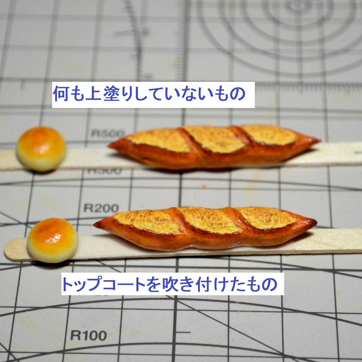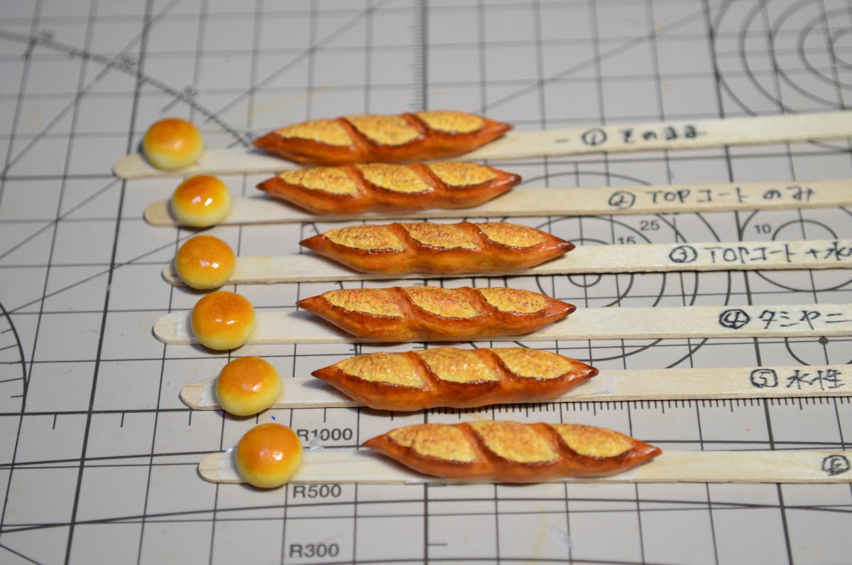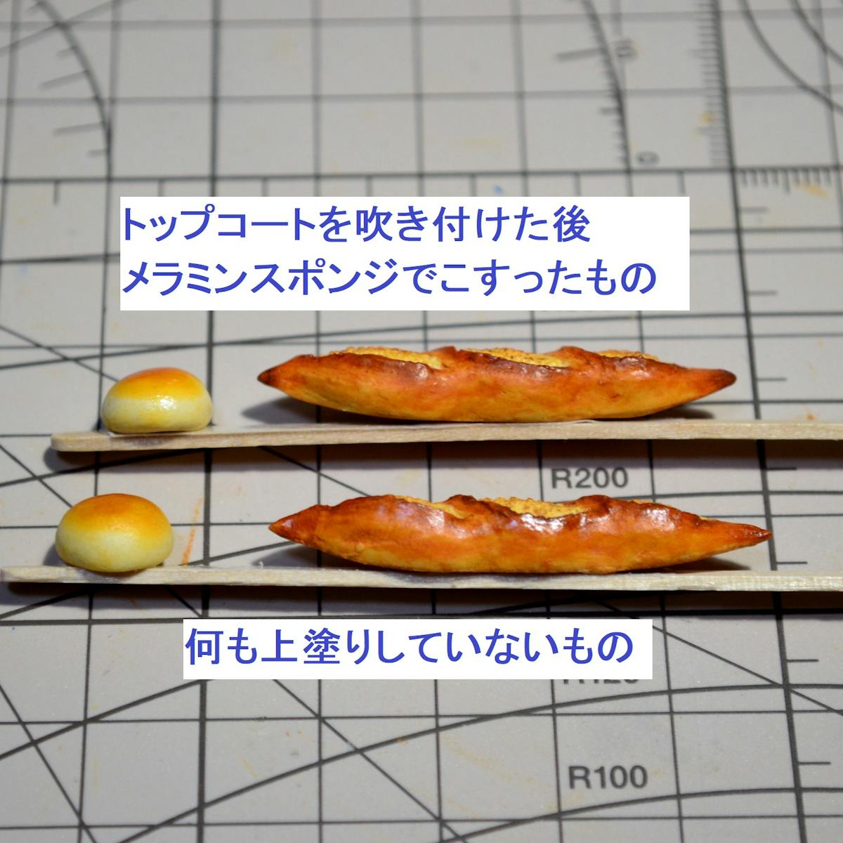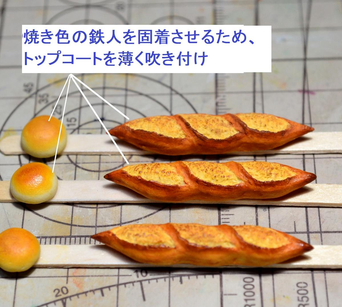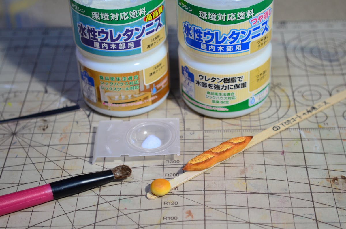 アンパンはツヤ有の水性ウレタンニス、バゲットは艶消しの水性ウレタンニスを塗りました。