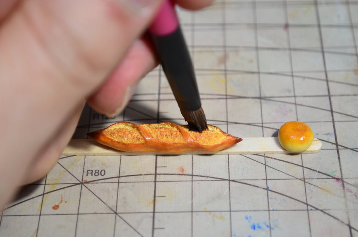 バゲットは、オリジナル絵具、アクリル絵の具、色鉛筆、焼き色の達人を総動員して着色しています。