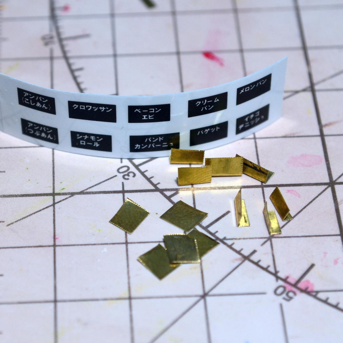 真鍮の板を小さく切り出して、平やっとこで曲げて、それにテプラを貼っています。