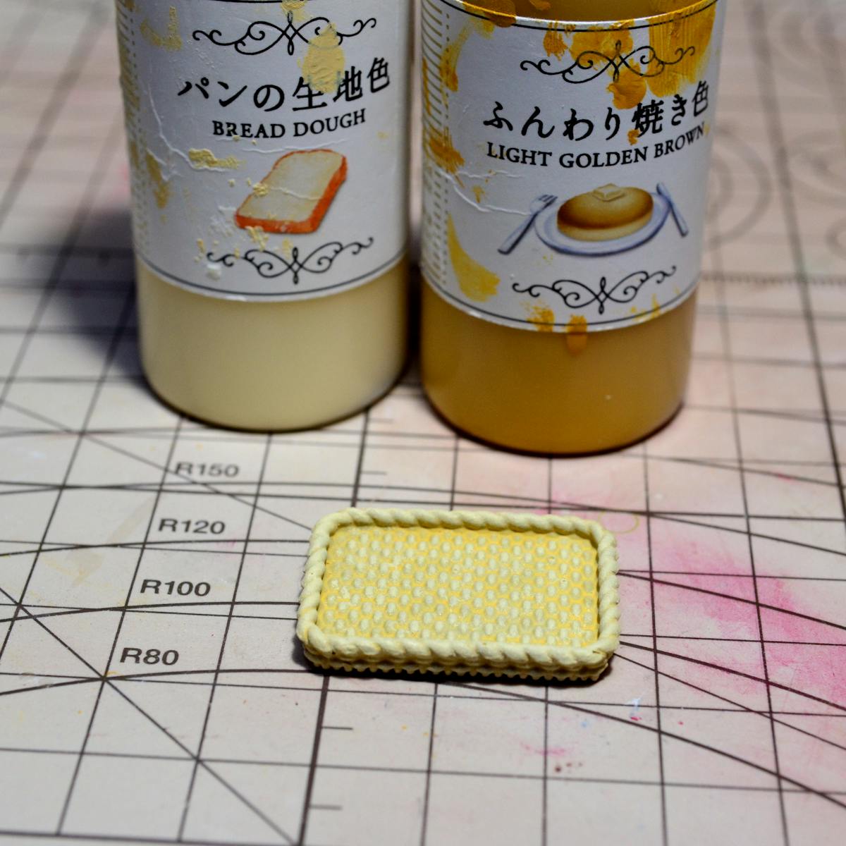メロンパンはサクッとした感じを出すために、タミヤ社のデコレーションシリーズの、「トッピングの達人(粉砂糖)」を最後に塗っています。