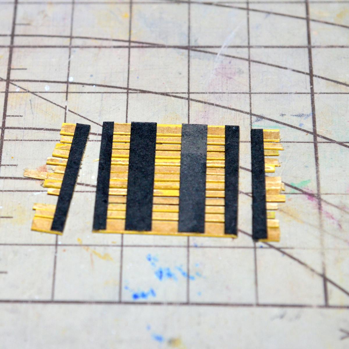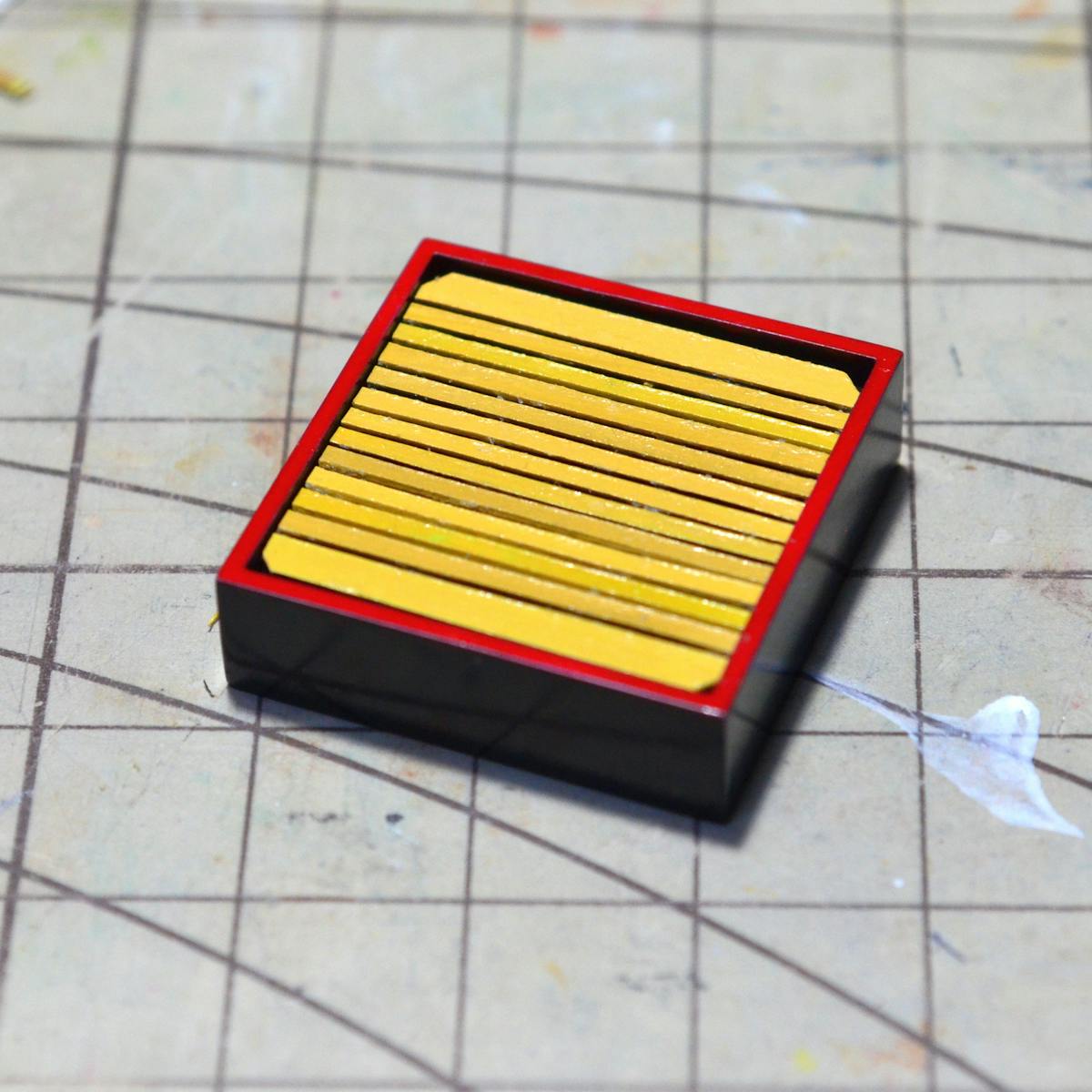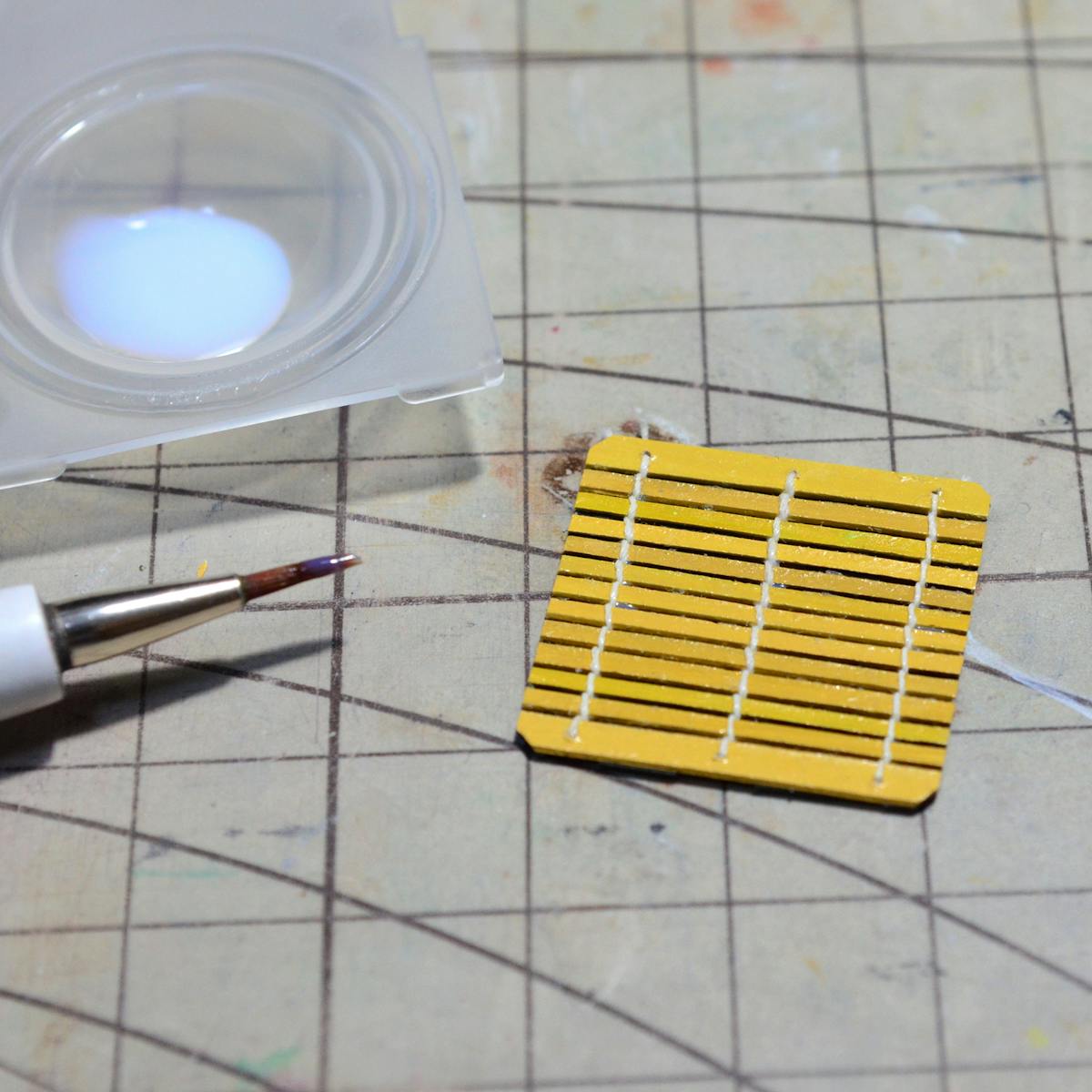 私は、下の写真の様に、ガムテープをカッティングマットの貼り付けて、一旦その上に瞬間強力接着剤を出してからつまようじ等で付けています。