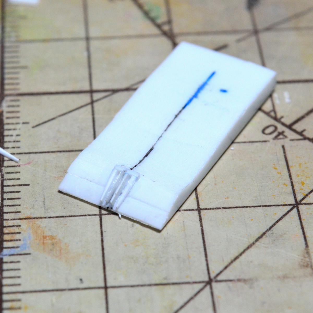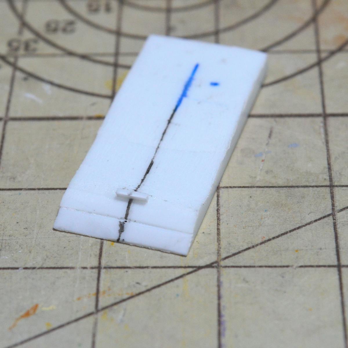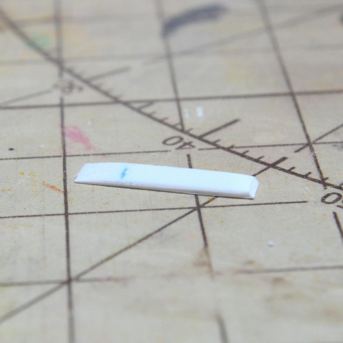 0.5mmのプラ板なのですが、端っこから3mmのところ(実物の爪の長さが約3cmなのでその10分の1)に線を引いています。