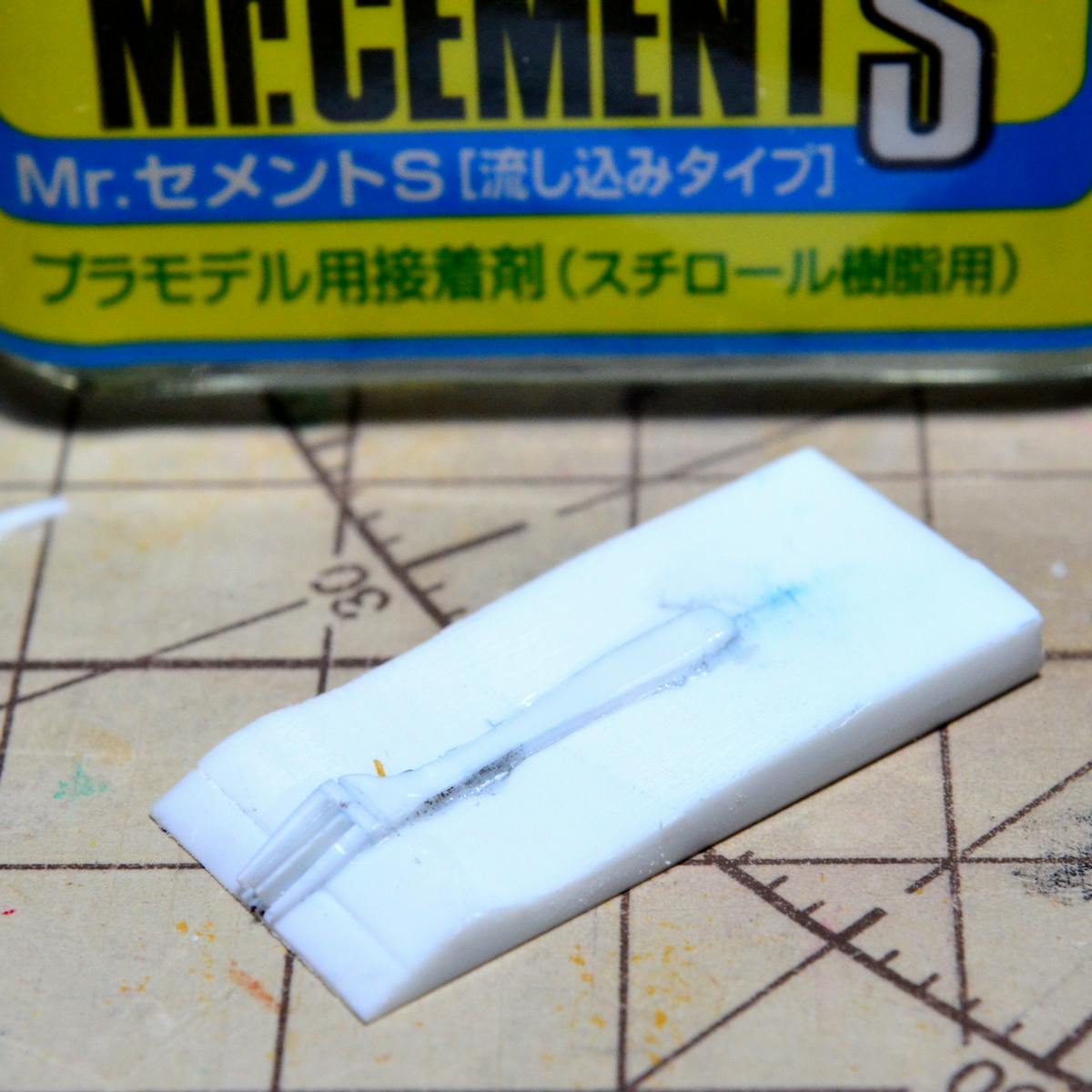 そのあと、液体がすぐに蒸発するので、合わせ目の両側の溶けたプラスチックが再度固まります。溶けた時に合わせ目のプラスチックが混ざり合っているので、固まった時に一体化することで接着されるという仕組みの接着剤です。