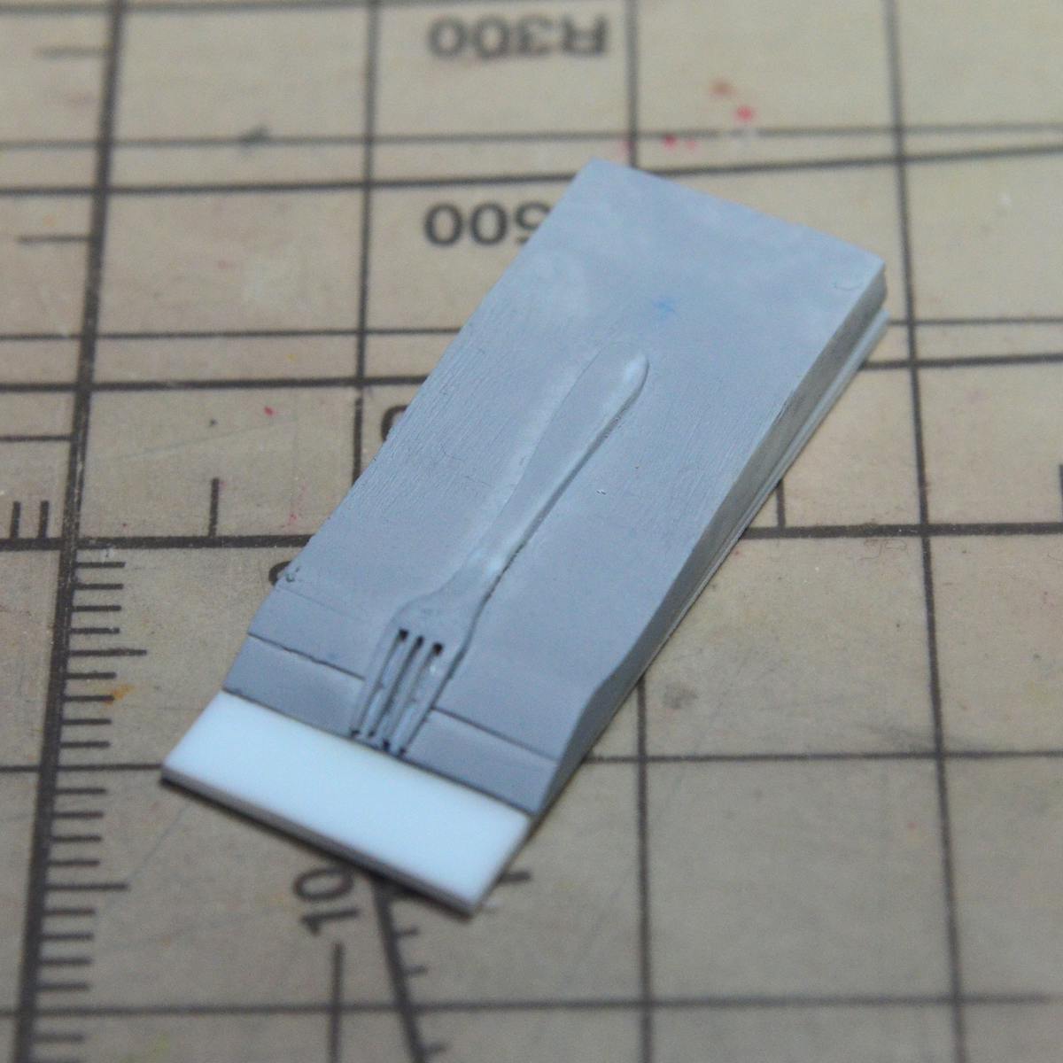 まずは、0.5mmのプラ板を2枚重ねて、フォークの形(横から見た形)に合わせて削っています。