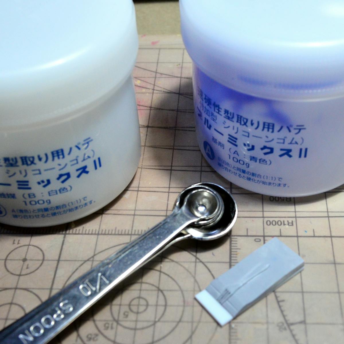 ブルーミックスは、青と白の材料を1:1で混ぜるのですが、付属のスプーンだと、ミニチュアフードで使うには大きすぎますよね。