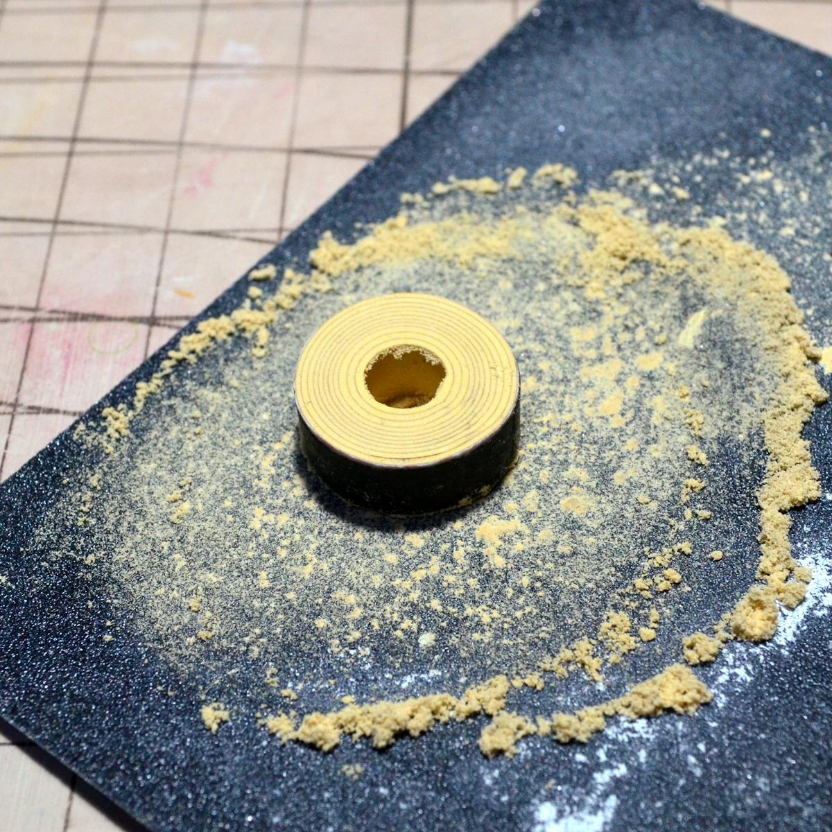 写真の様に、紙やすりの上でバウムクーヘンを動かすようにするときれいな面になります。