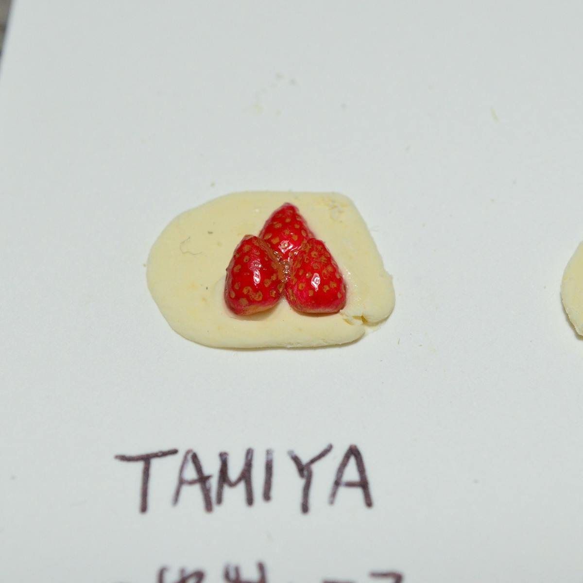 今回はタミヤ社のカスタードクリームを使いました。接着力が有るのでイチゴの固定に使えます。