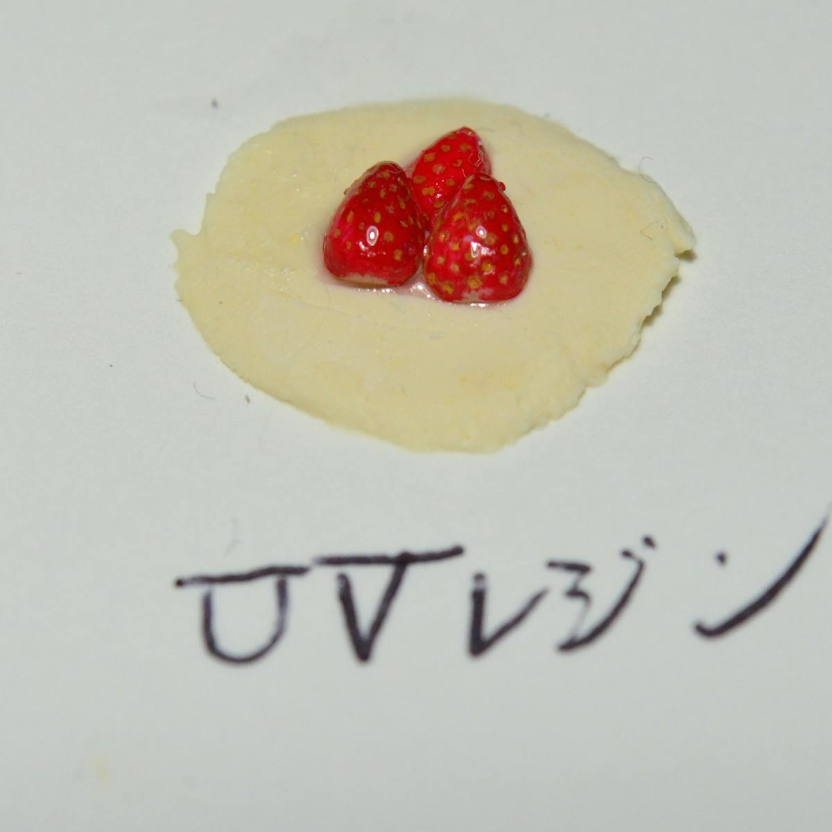 あと、UVライトの光が当たらない奥まった部分(イチゴが重なった裏側)にもレジンが浸透してしまうので、固まらないレジンが残るのが嫌だなぁ、と思ってしまいました。2液混合を使えばいいのですが、2液混合は固まるまでの時間が長いので、こういう凸凹したものに塗ると奥の方に流れていきそうです(試して無いのですが)。
