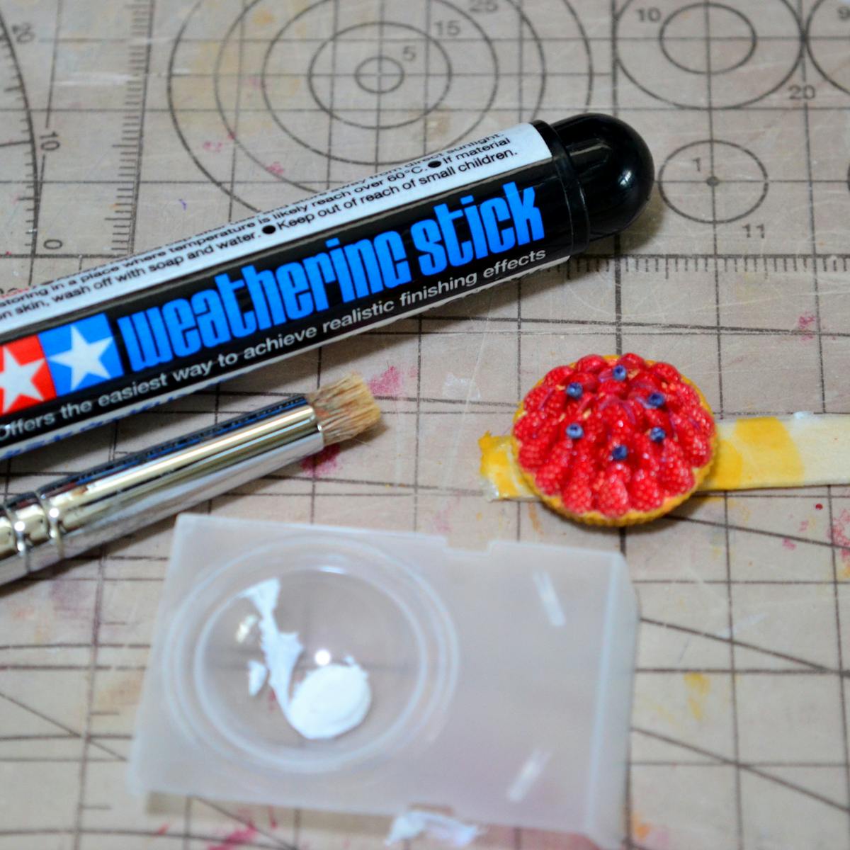 やり方ですが、筆の先端を、皿に取ったウェザリングスティック(の中身)の上でトントンとやって、筆の先にほんの少しウェザリングスティック(の中身)を付けます。毛一本一本の先についているウェザリングスティック(の中身)が粉砂糖の一粒になります。これをタルトの周囲にチョンチョンとしていきます。押し付けるというより、軽く当てていく感じです。