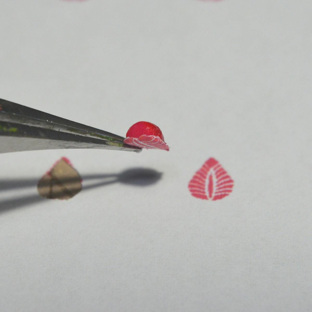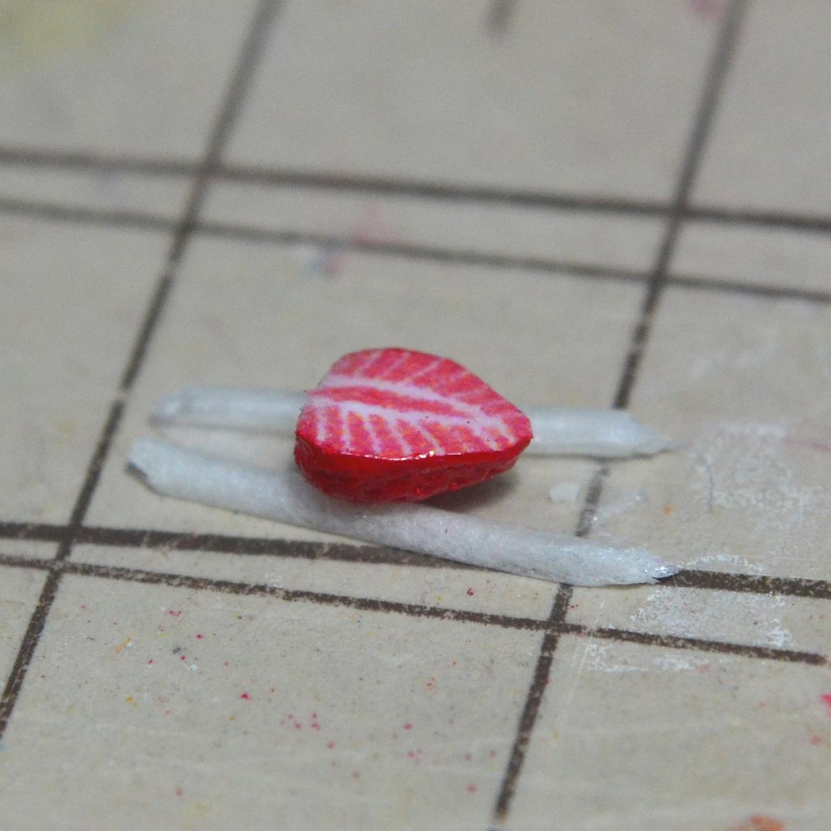 鋏でカットする時に削れてしまった部分を赤で塗ってから、ニスを塗って断面のシズル感を出してみました。