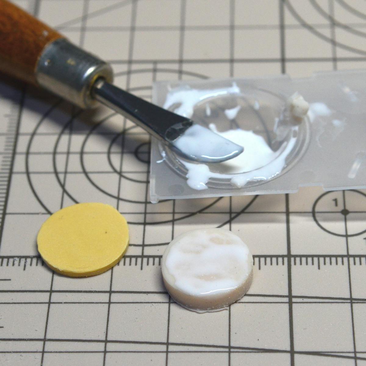 スポンジとクリームを、単に木工用ボンドで接着すると、隙間に入り込んだボンドが透明になりすぎるので、粘土(クリーム用に白を少量加えたもの)を水で溶いて、木工用ボンドを少し加えたもので接着します。