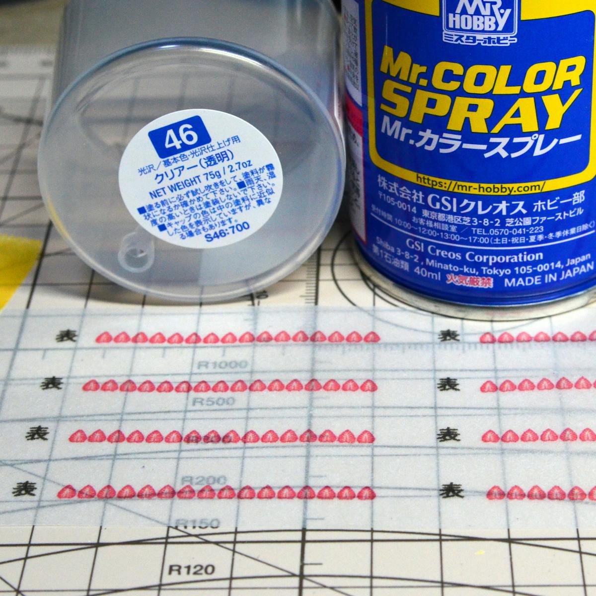 そして、表からクレオス社のプラモデル用のクリアのスプレー(ラッカー系と言われる塗料です)を薄く2回ぐらい吹いておきます。