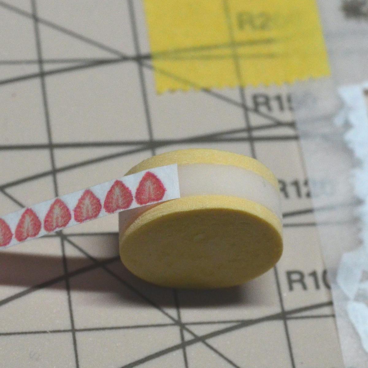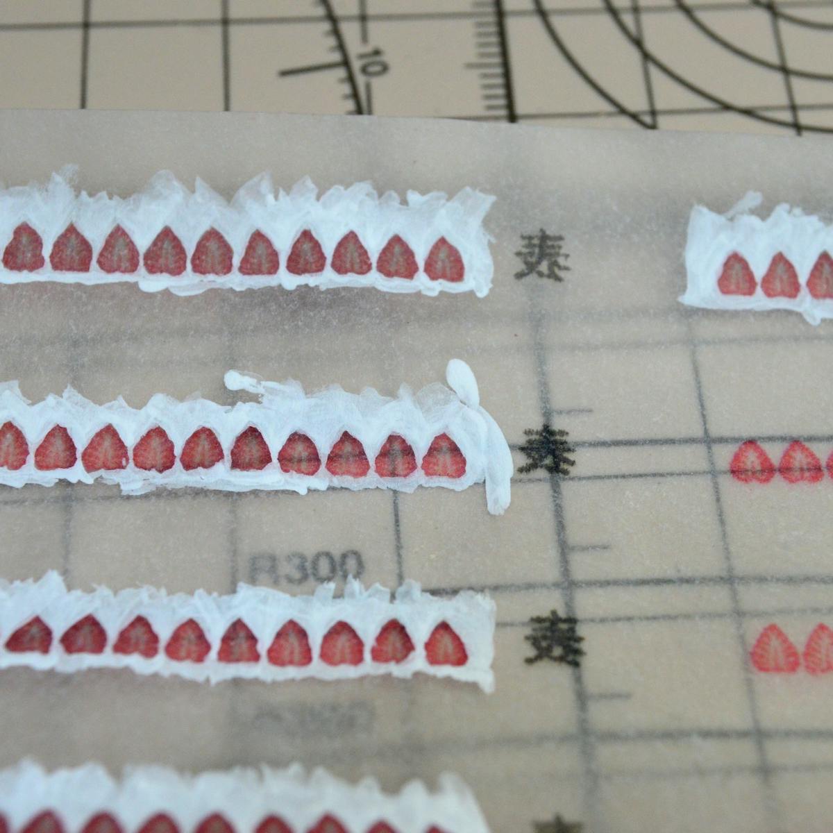 実はここからが難関です。印刷したイチゴの断面ですが、実際にクリーム部分の外周に当ててみるとわかるのですが、外周より少し(イチゴ半分)短めにしています。
