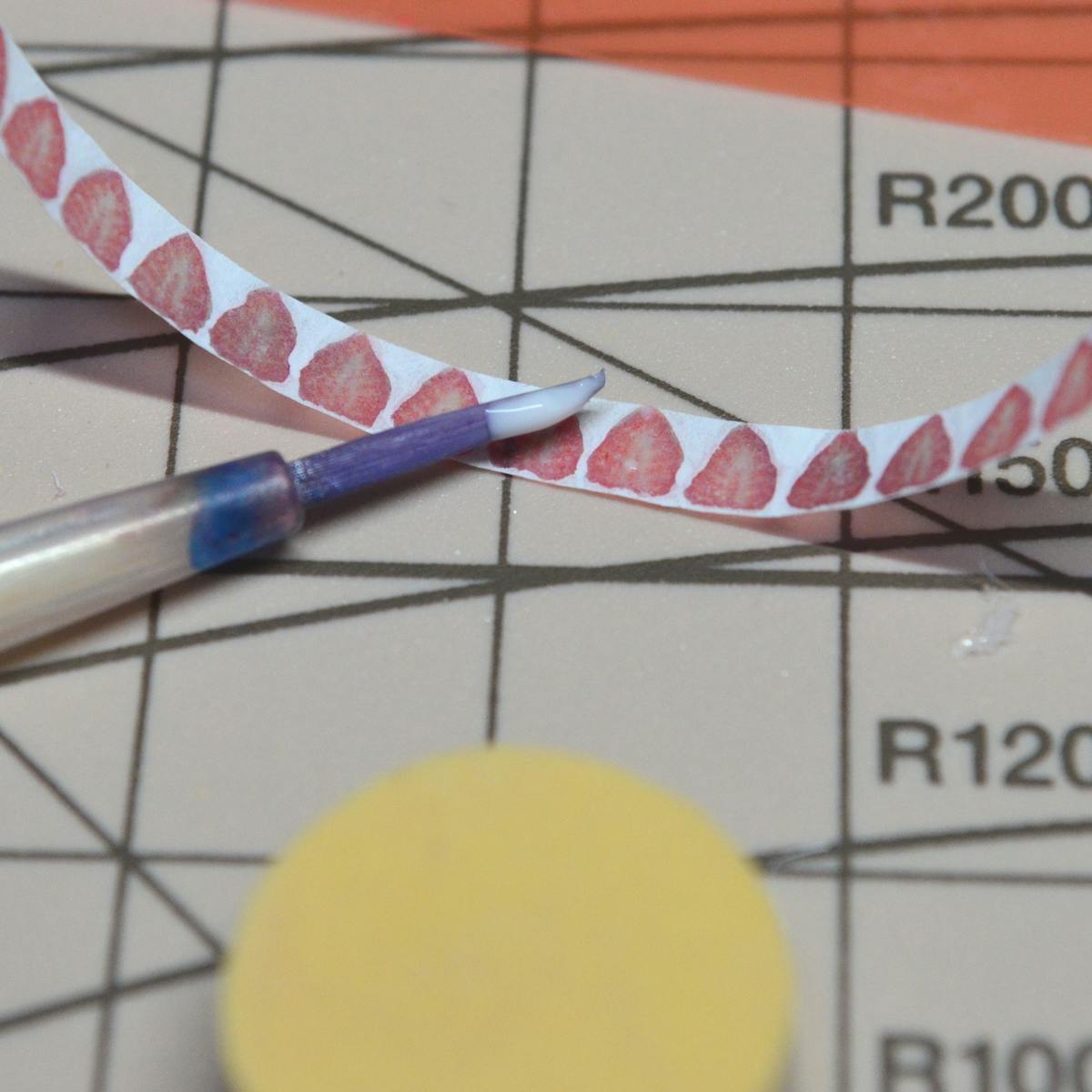 まずは印刷したイチゴの断面の真ん中に少し薄めた接着剤を筆で塗って接着します。