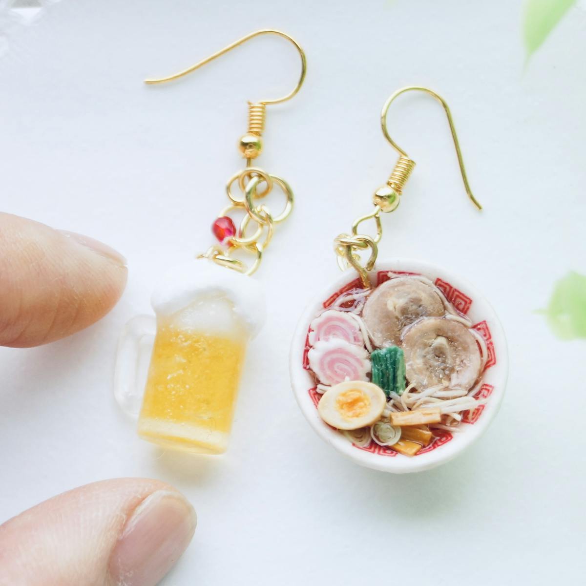 ラーメンとビールのピアス(アレルギー対応あり/陶器アクセサリー)