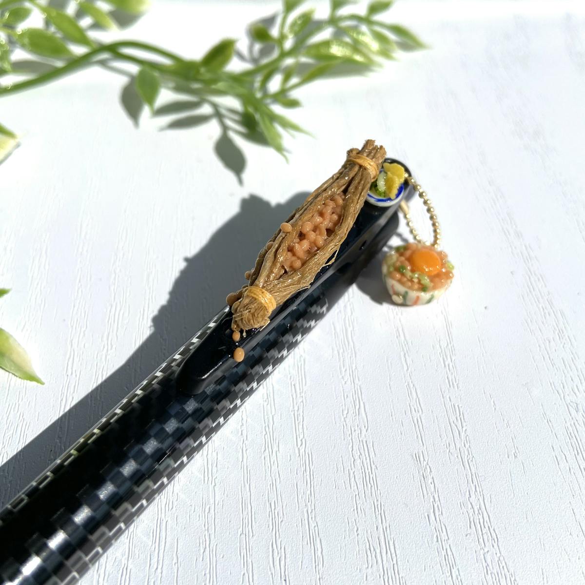 藁納豆がボールペンについたオリジナル感たっぷりな商品です。納豆がお好きな方にはたまらない一品なのではないでしょうか。つやつやな黄身と小口ネギをのせた納豆ご飯がゆらゆらと食欲をそそるかも。