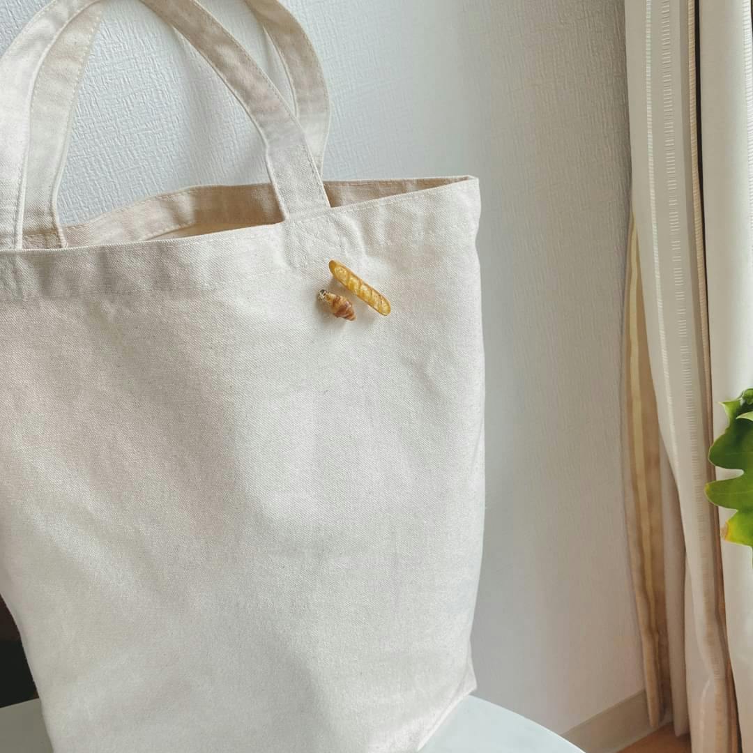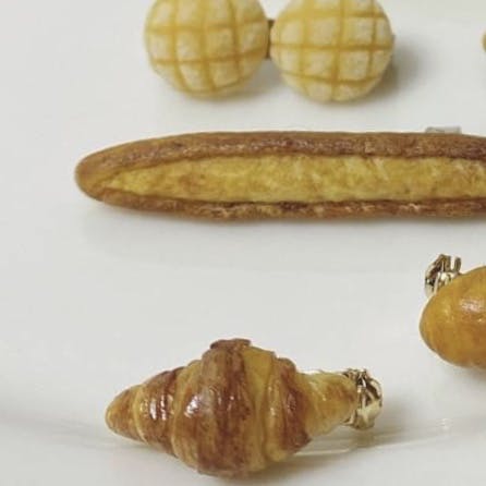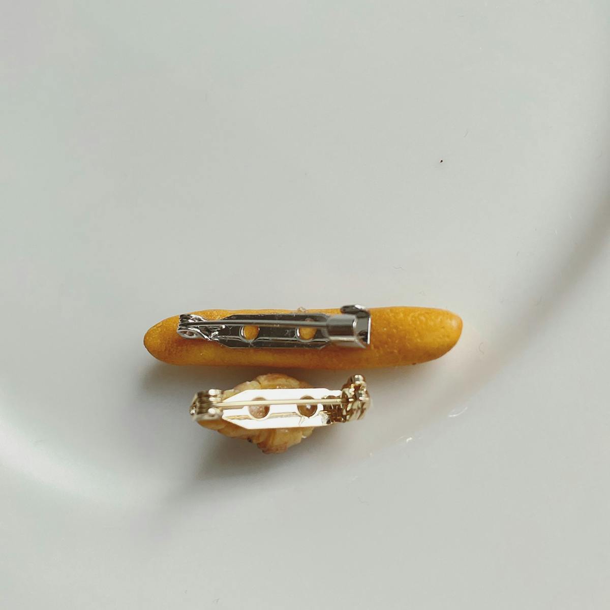 樹脂粘土で作ったフランスパンとクロワッサンのブローチ、2つセットです。