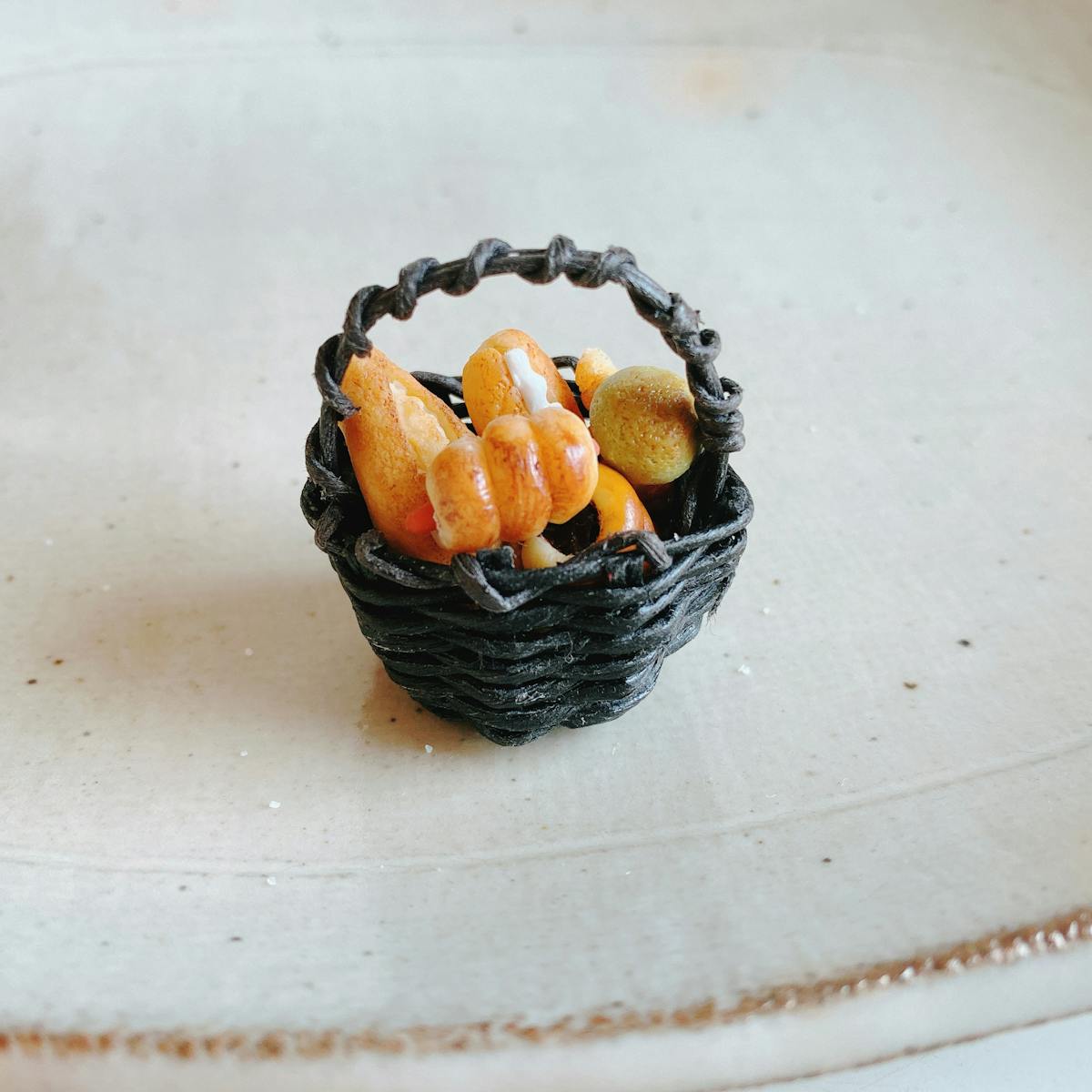 樹脂粘土で作ったパン7つとカゴのセットです。