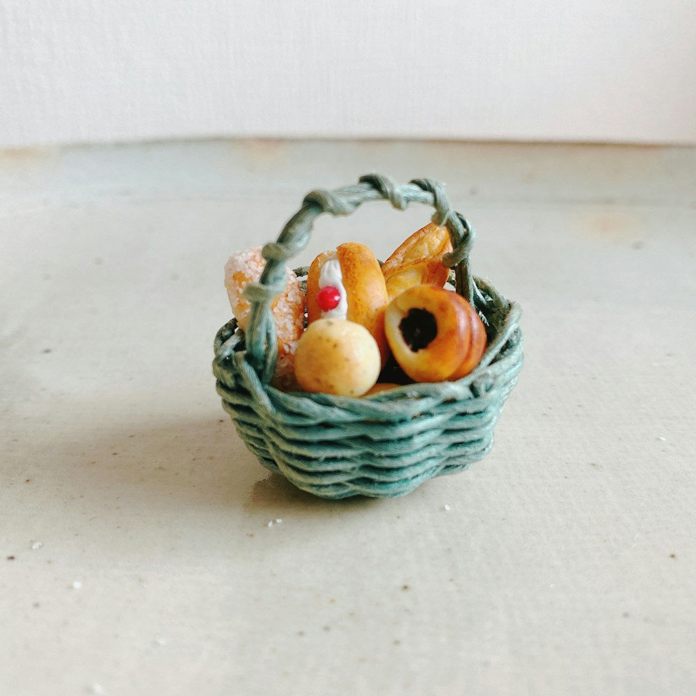樹脂粘土で作ったパン7つとカゴのセットです。