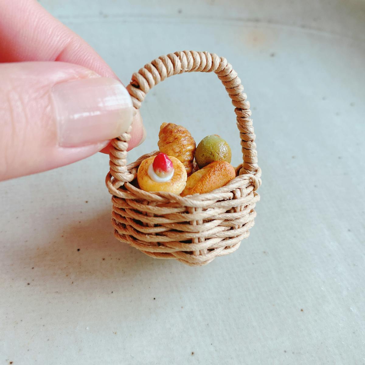 樹脂粘土で作ったパン7つとカゴのセットです。