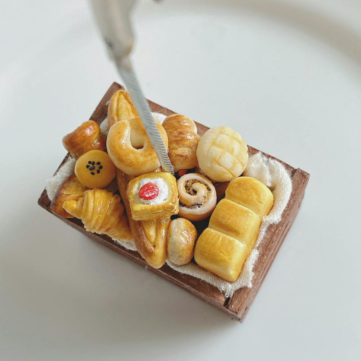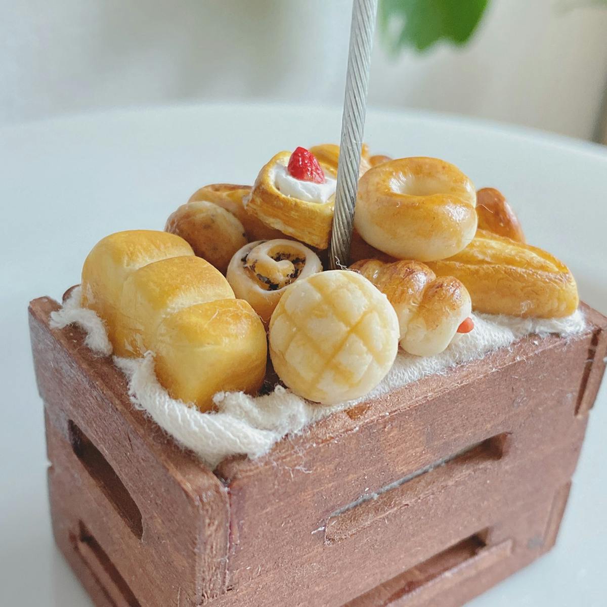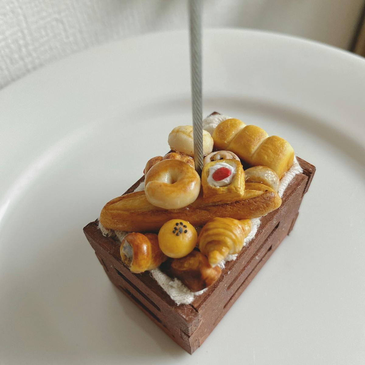 樹脂粘土で作ったパンを木箱に詰め込んだカードスタンドです。