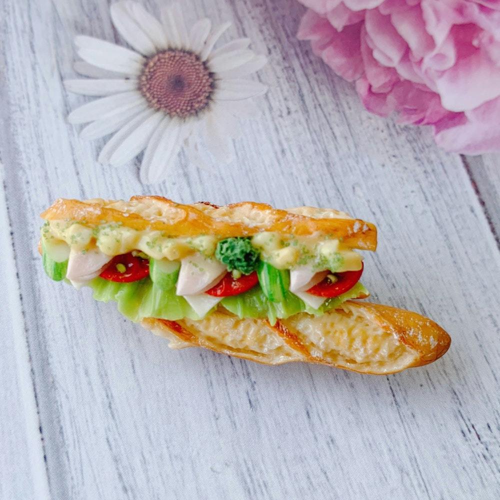 こんがり焼けたバケットに、レタス、きゅうり、ブロッコリーやトマトなど詰め込んで、スクランブルエッグも挟み込みました。