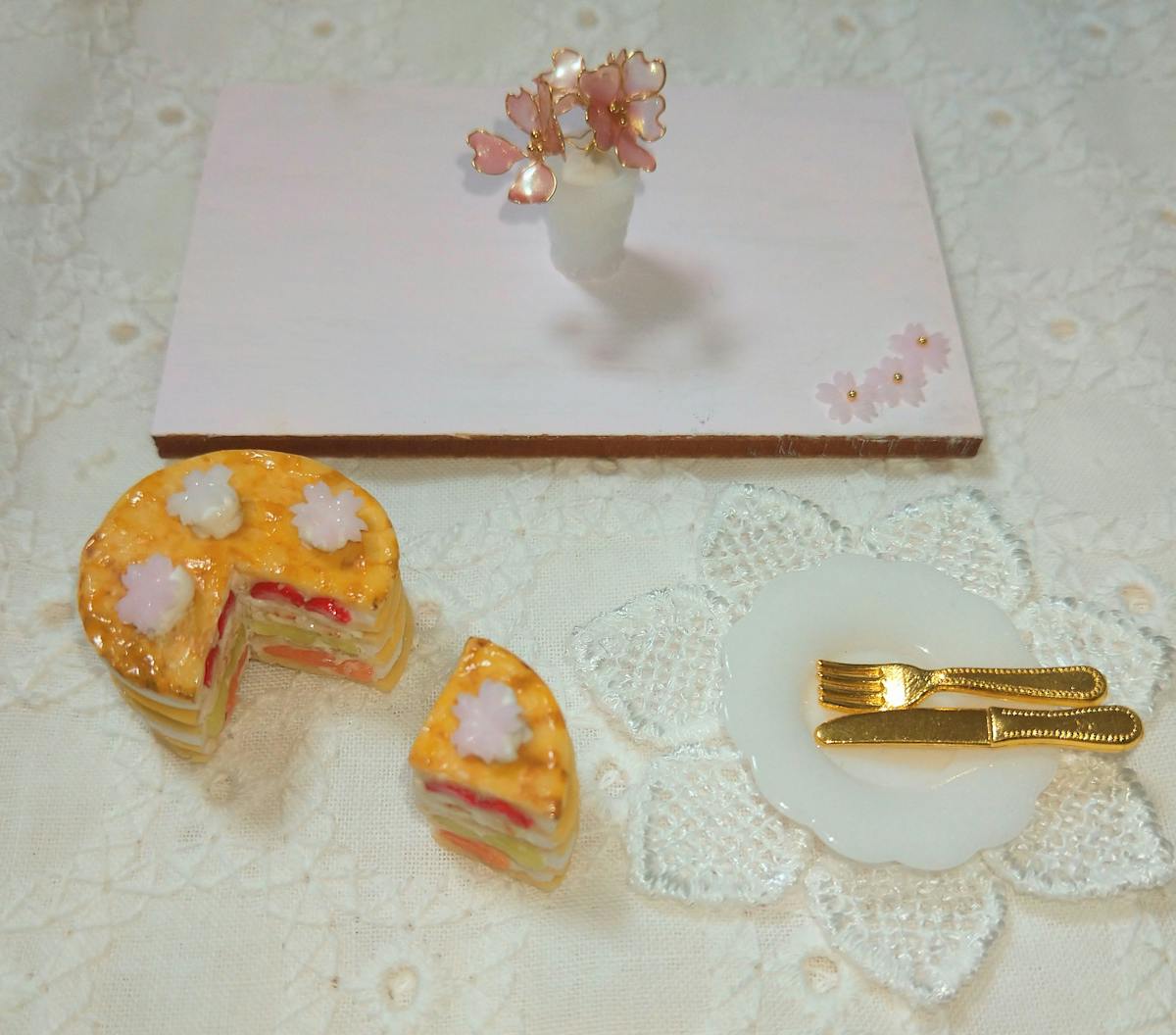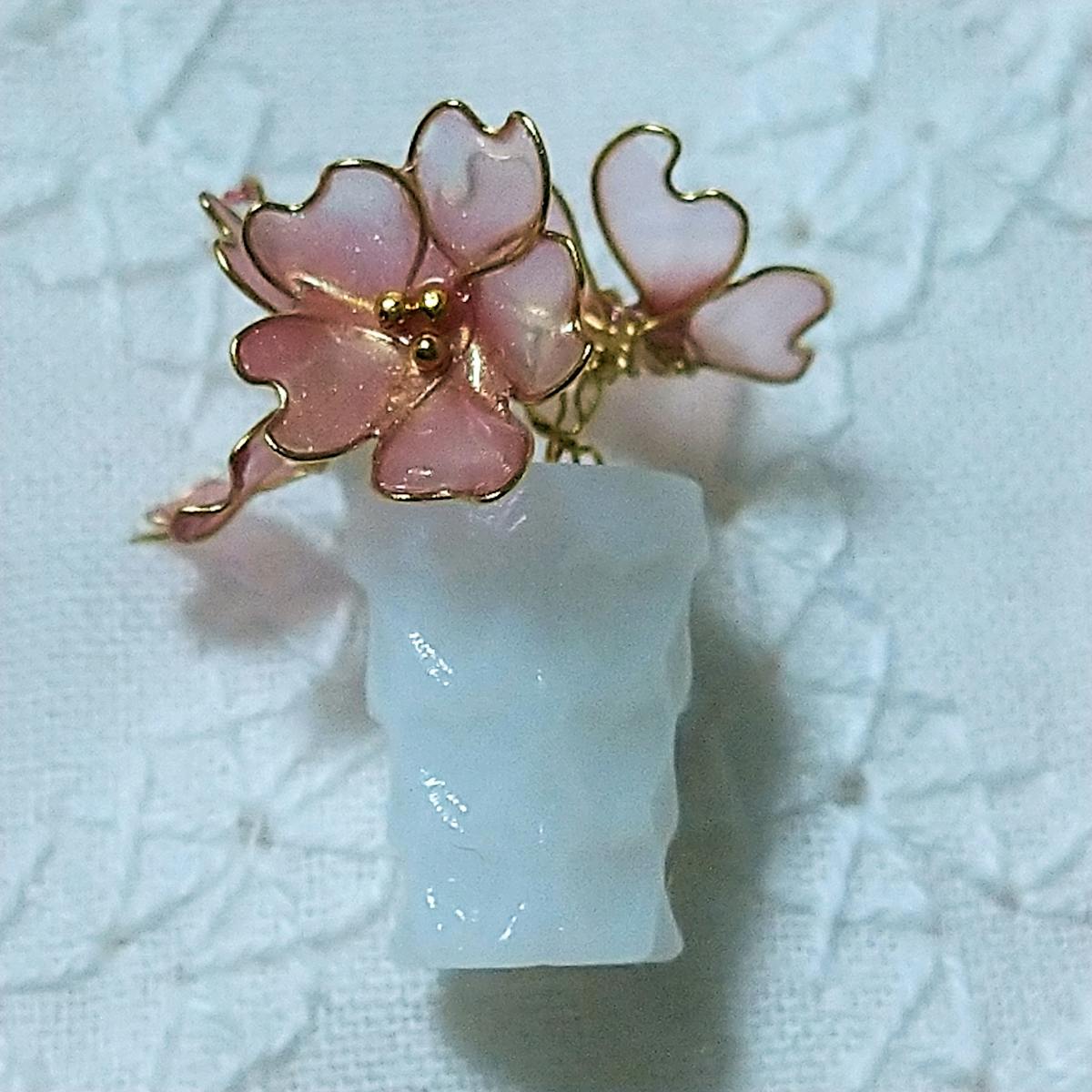 アメリカンフラワーの桜や、花皿、花レース、飾り板にも3連の小さな桜を…