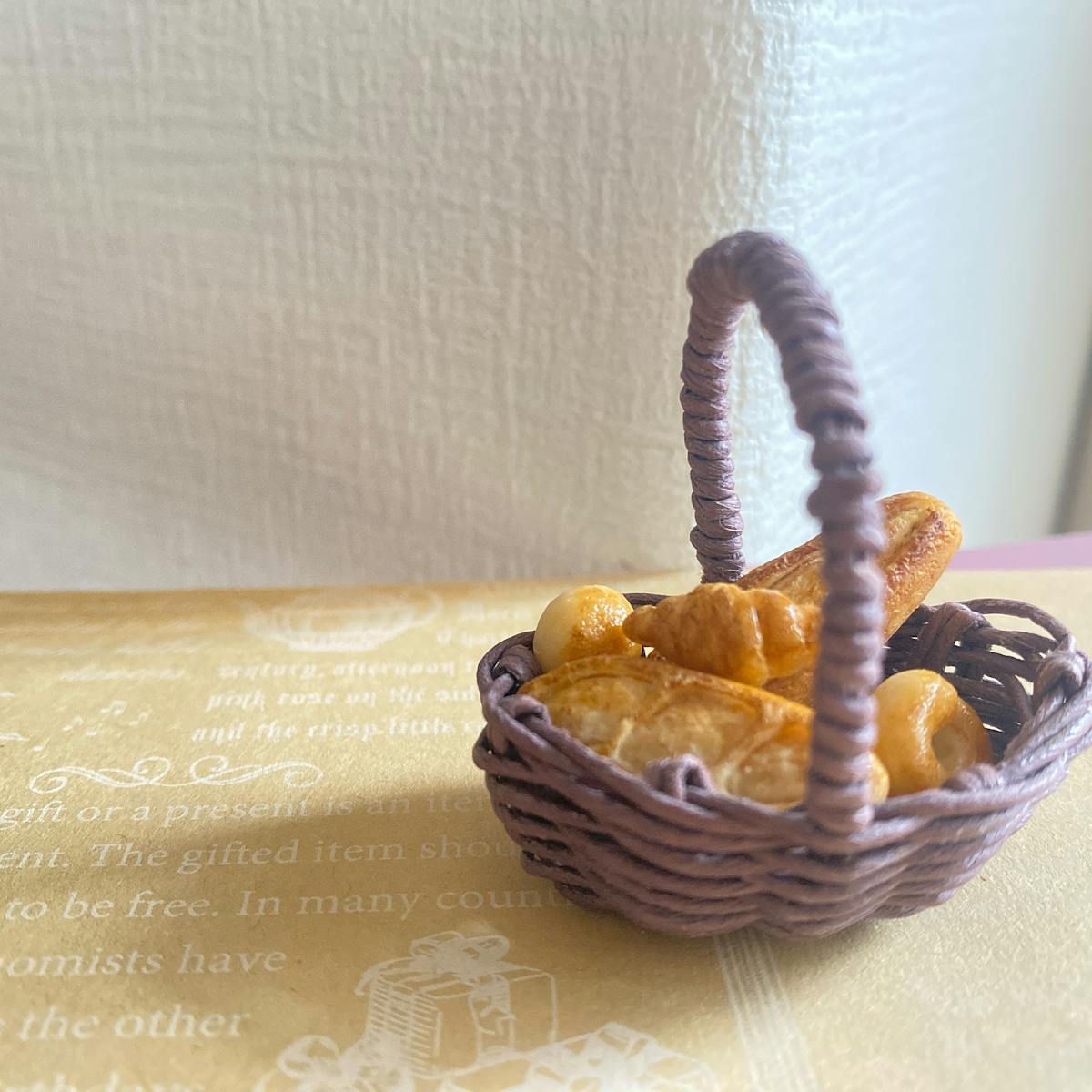 樹脂粘土で作ったパン7つとカゴのセットです。