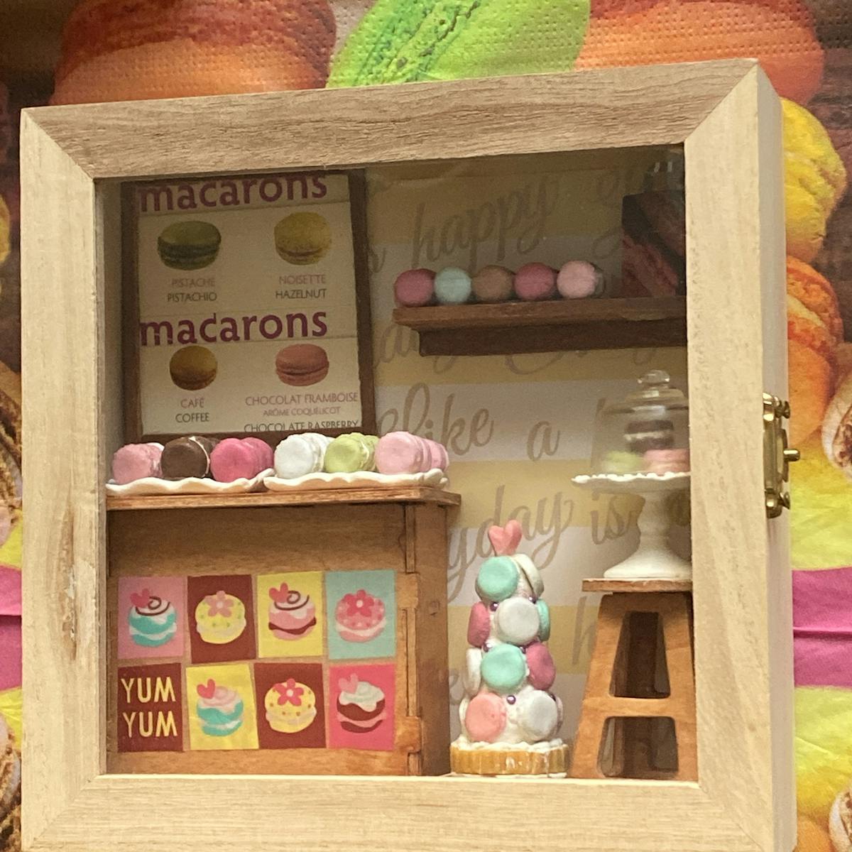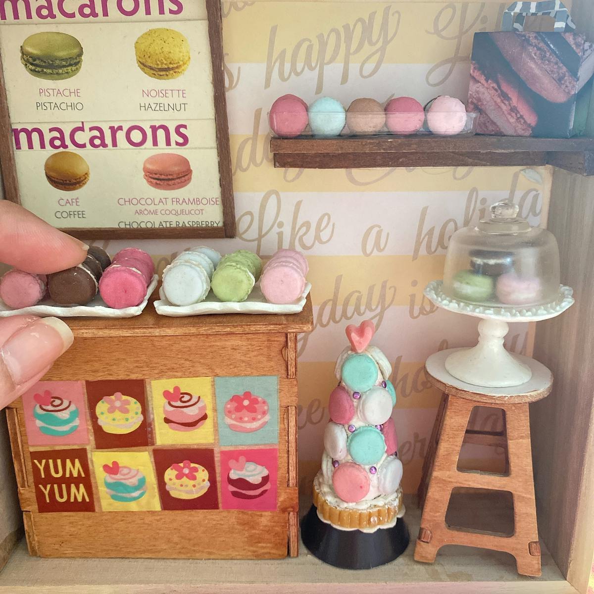 粘土で作ったマカロンを並べ、マカロンショップにしました。全て接着済みです。