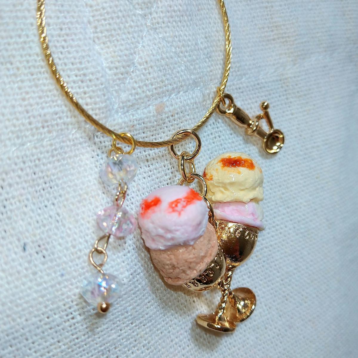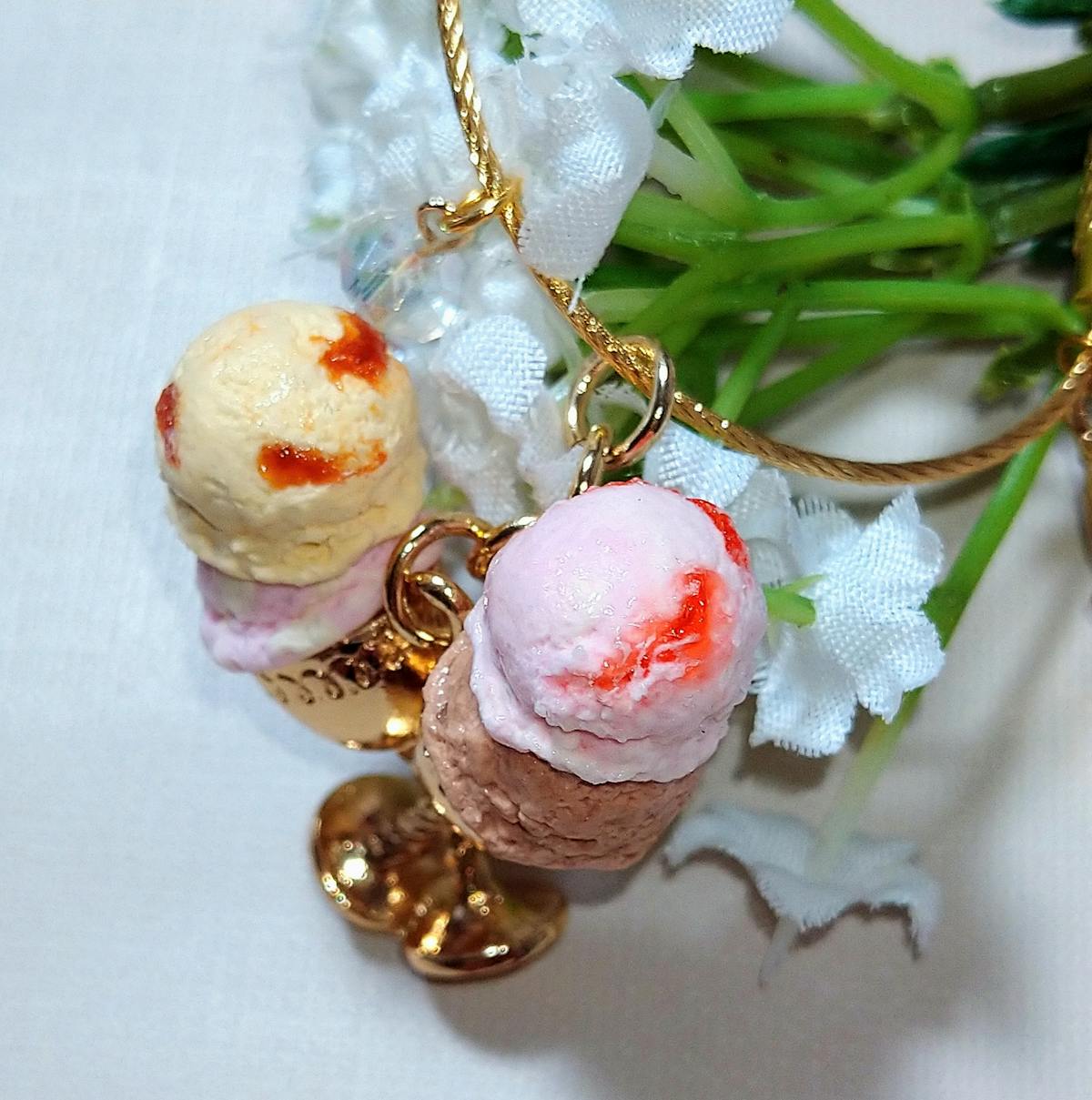 とろ〜りキャラメル、イチゴピューレを使ったストロベリー、バニラとストロベリー、コーヒー、4種のアイスクリームをバッグチャームにしてみました♪