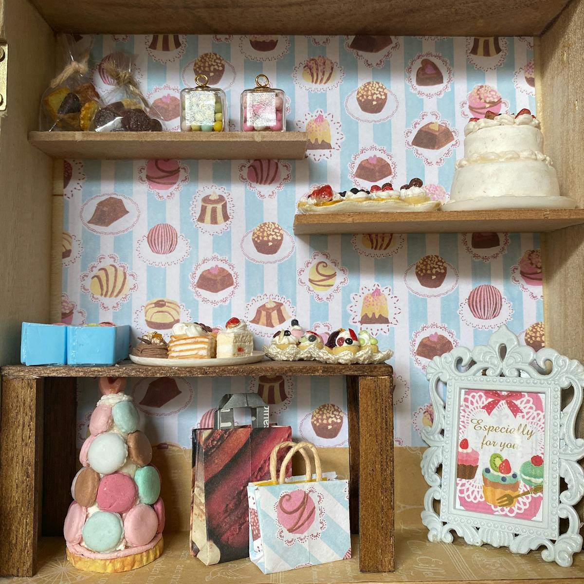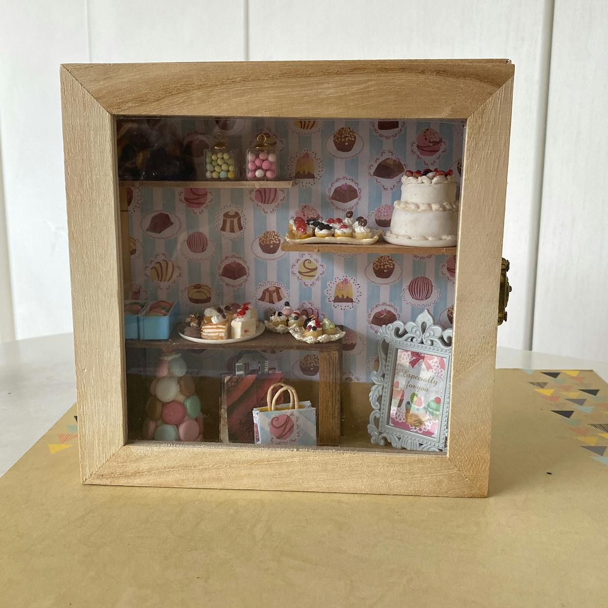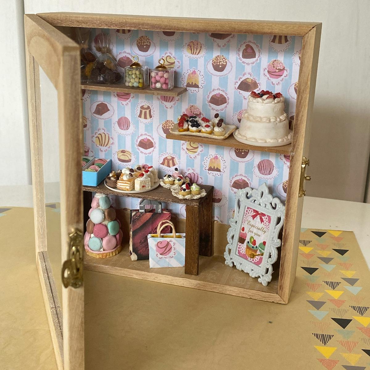 樹脂粘土で作ったお菓子を並べ、スイーツショップにしました。全て接着済みです。