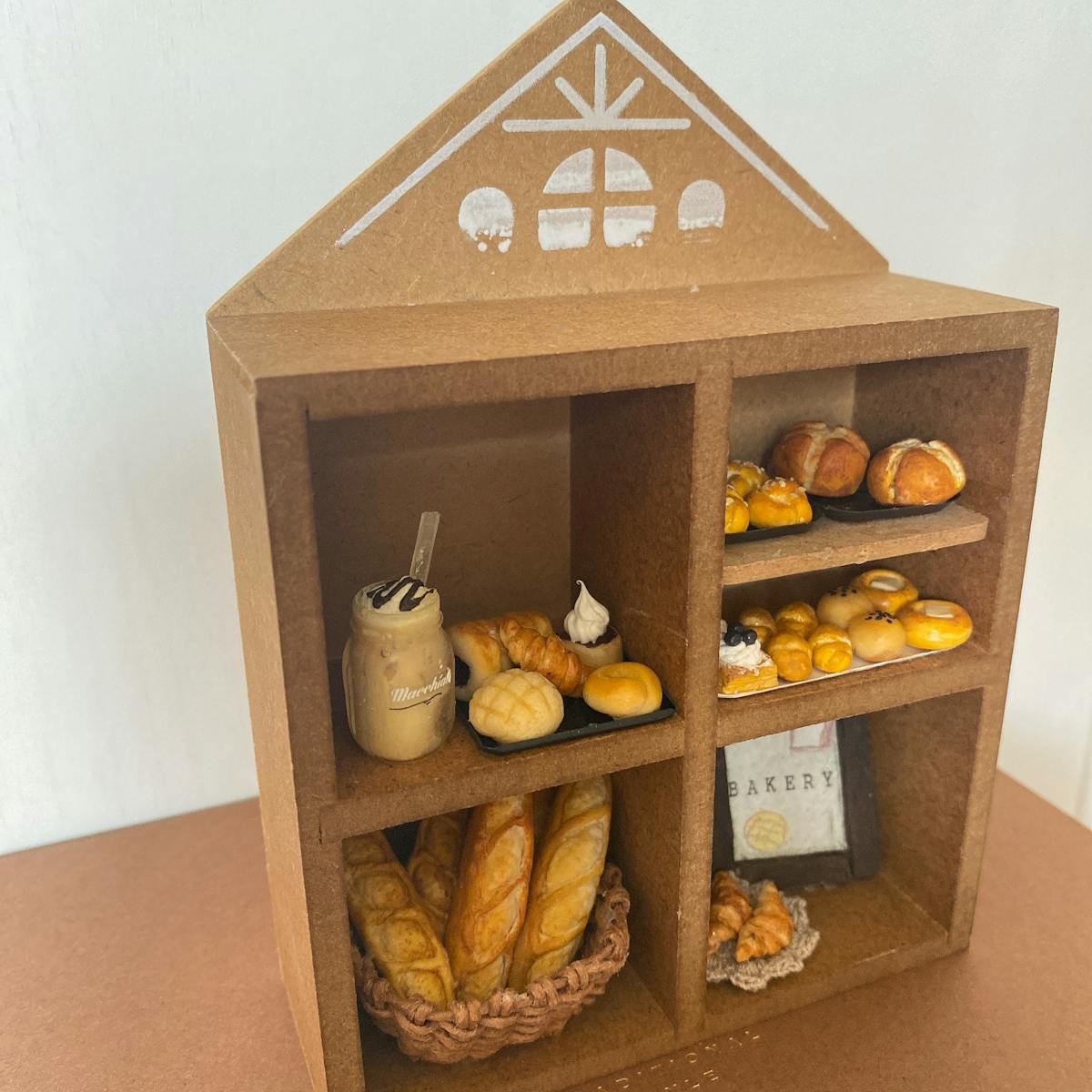 樹脂粘土で作ったパンを並べ、パン屋さんにしました。全て接着済みです。
