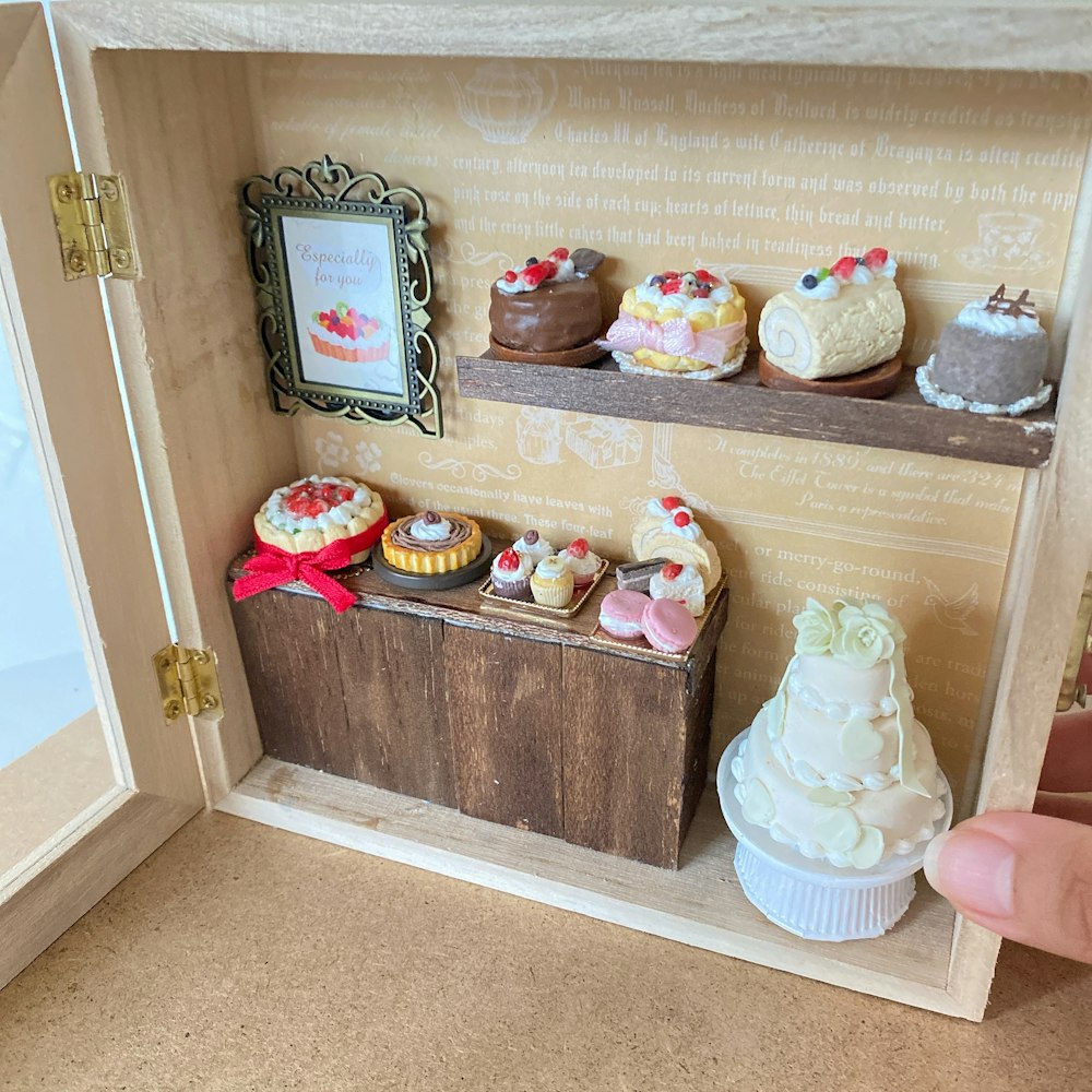 樹脂粘土で作ったお菓子を並べ、スイーツショップにしました。全て接着済みです。