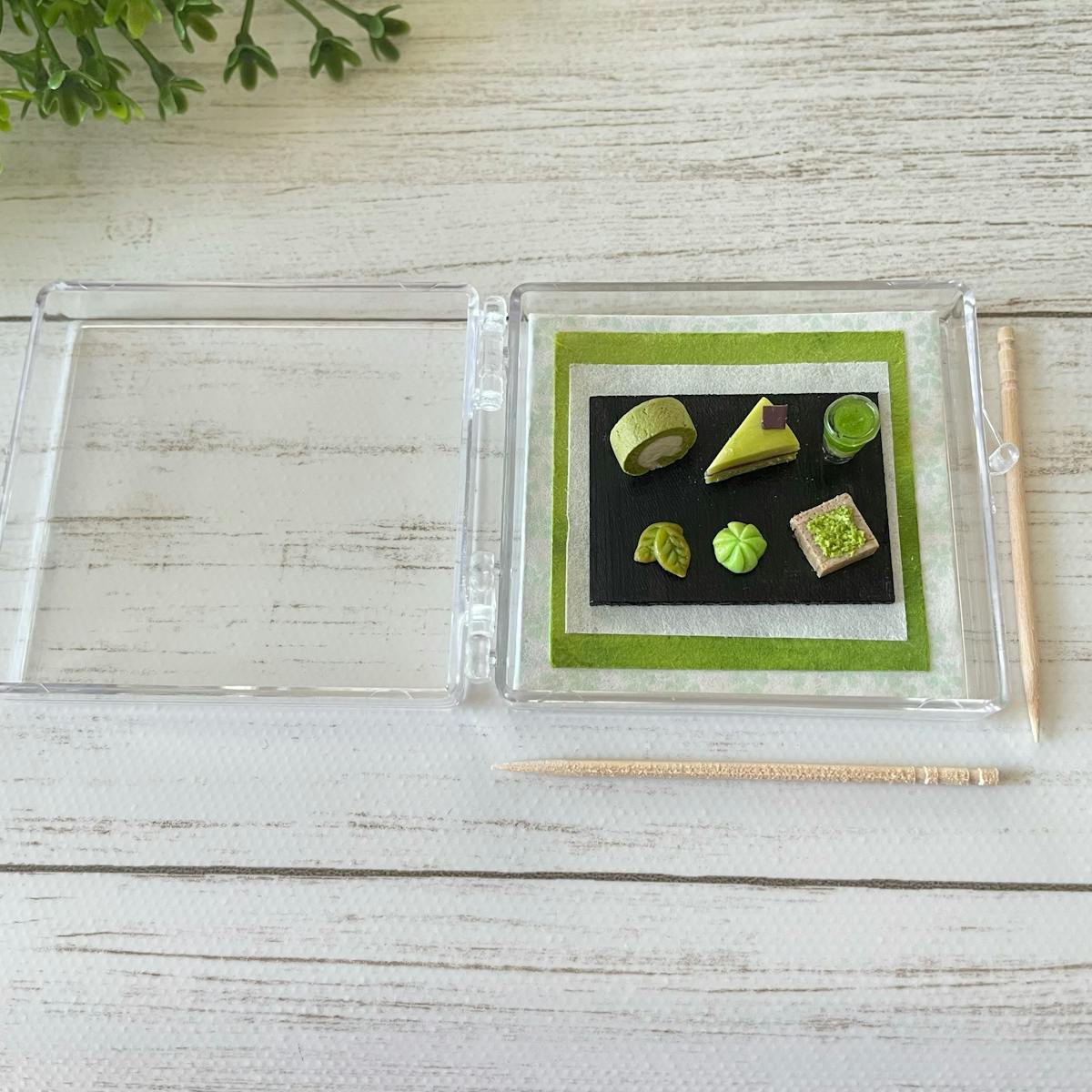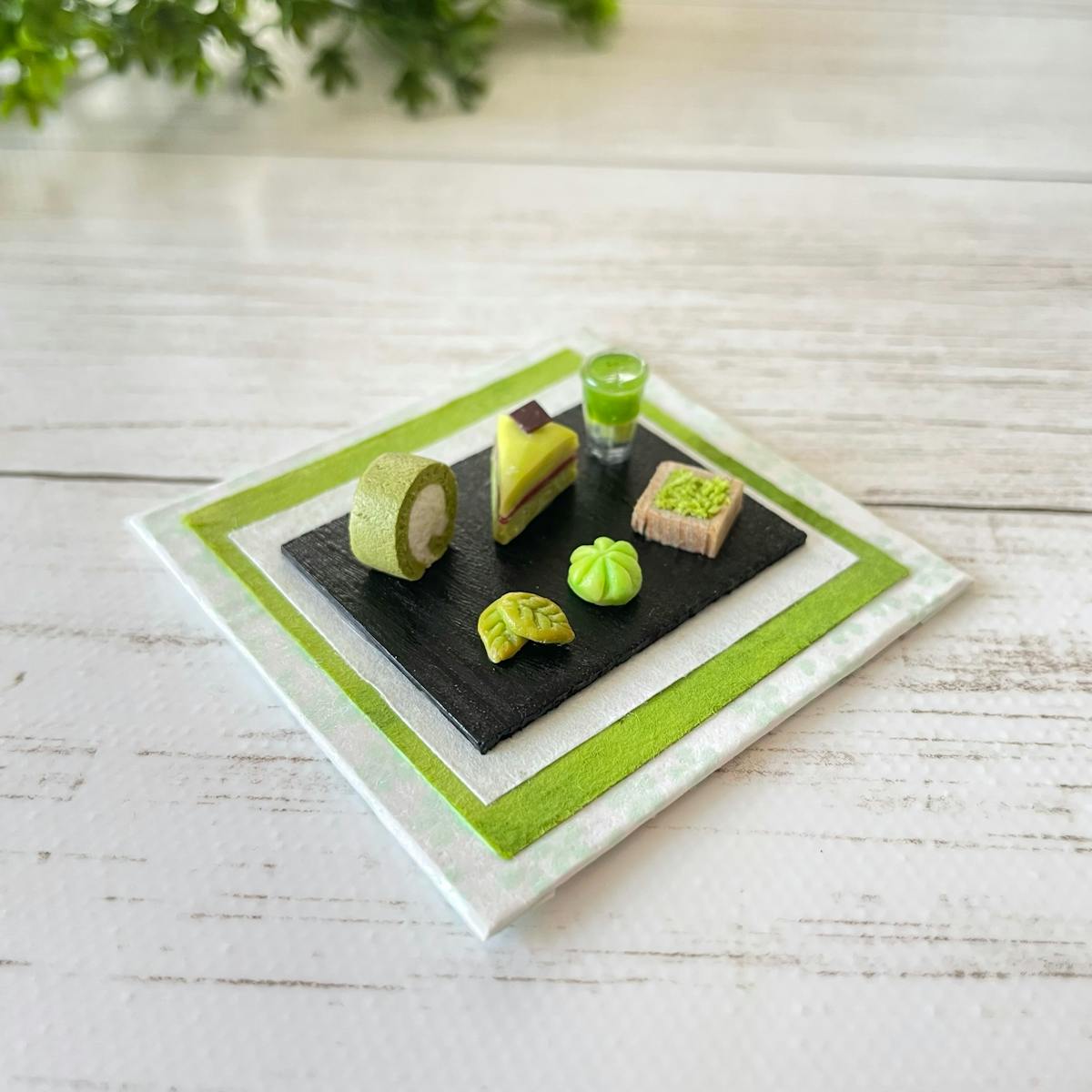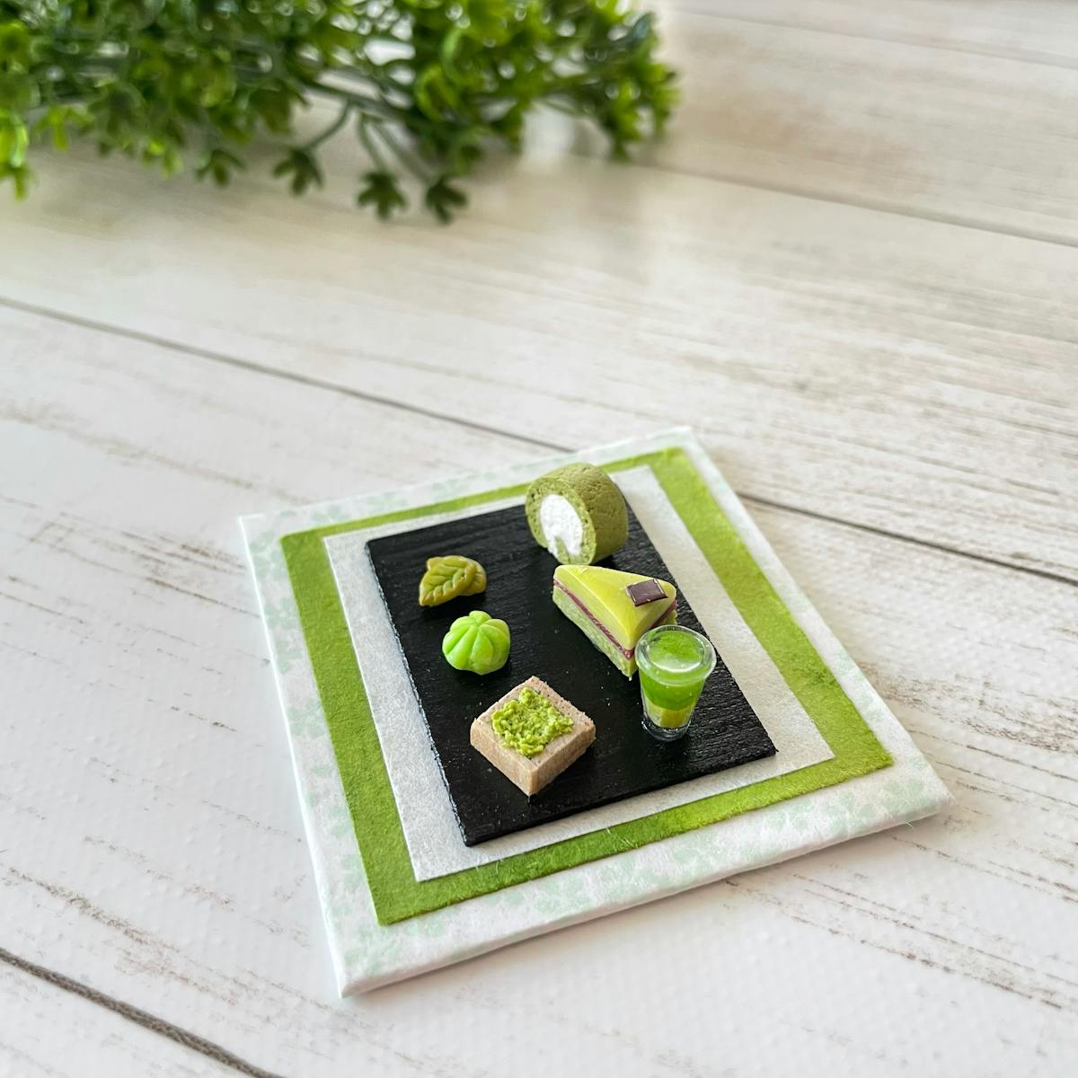 樹脂粘土で作った抹茶プレート(ロールケーキ・抹茶ケーキ・ムース・クッキー・和菓子・升に入ったチーズケーキ)