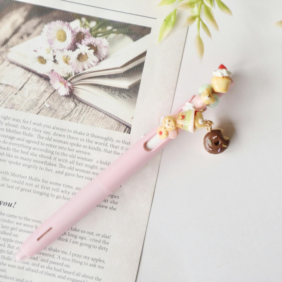チョコドーナツが揺れるミニチュアデザートのボールペンです♡(持ち手ピンク インク黒)