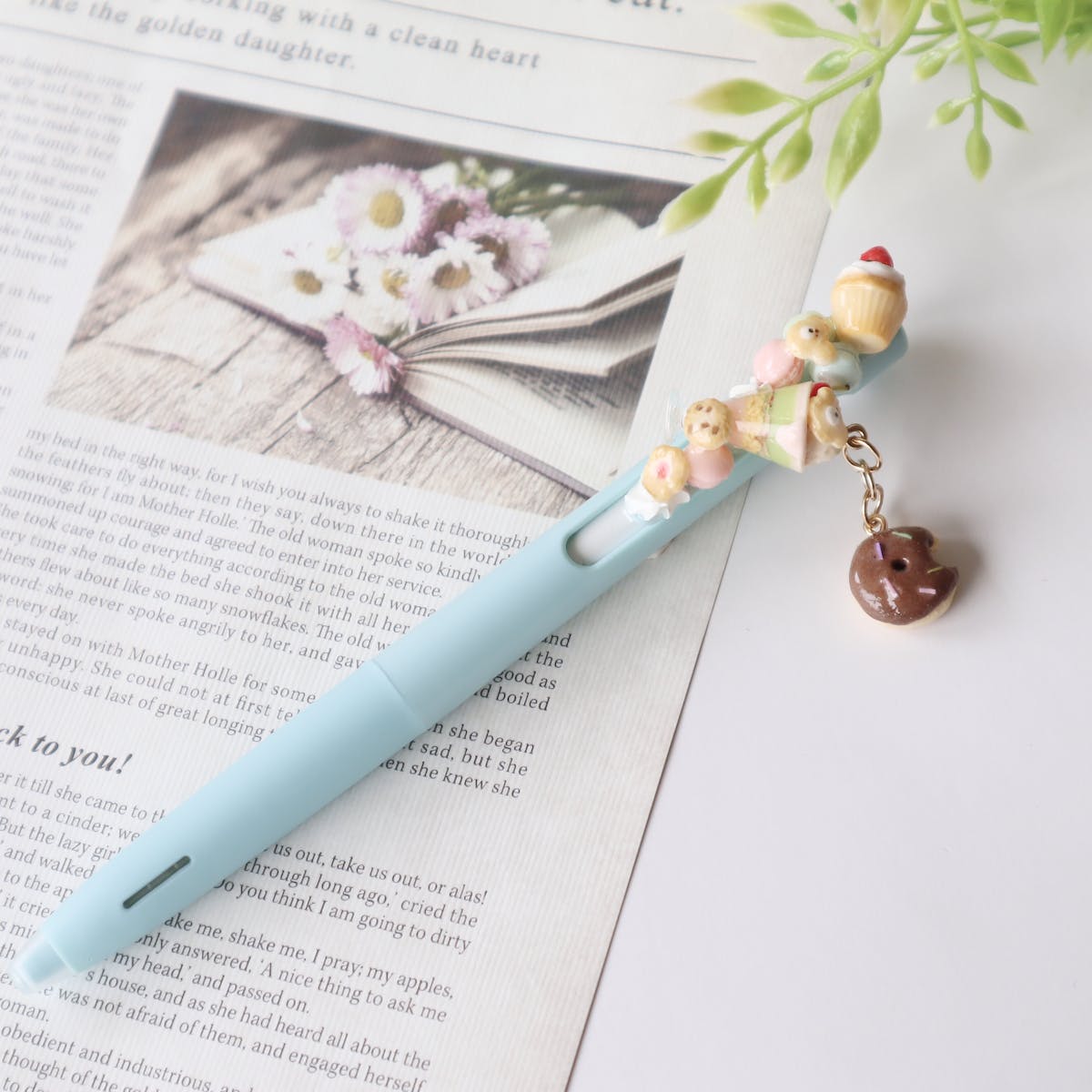 チョコドーナツが揺れるミニチュアデザートのボールペンです♡(持ち手グリーン インク黒)