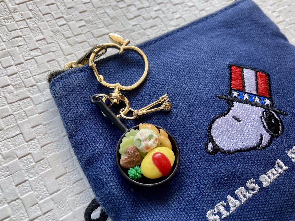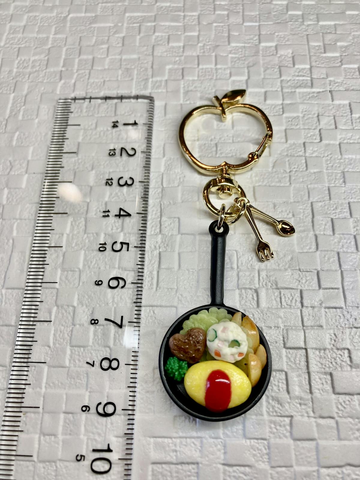 小さなフライパンにオムレツとハートの形のハンバーグを盛りつけ、可愛いキーホルダーにしました✨