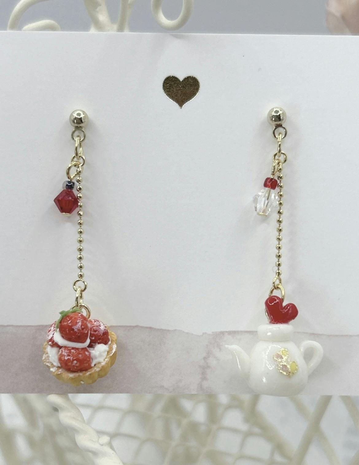 いちごのミニタルトと、小さなティーポットのピアス(イヤリング)