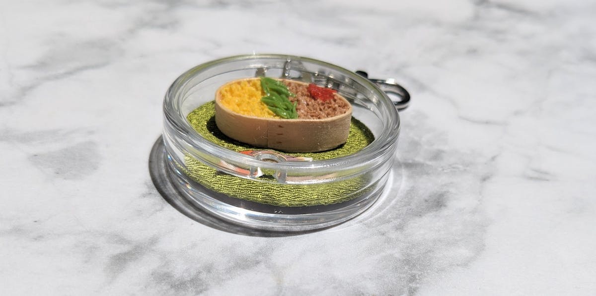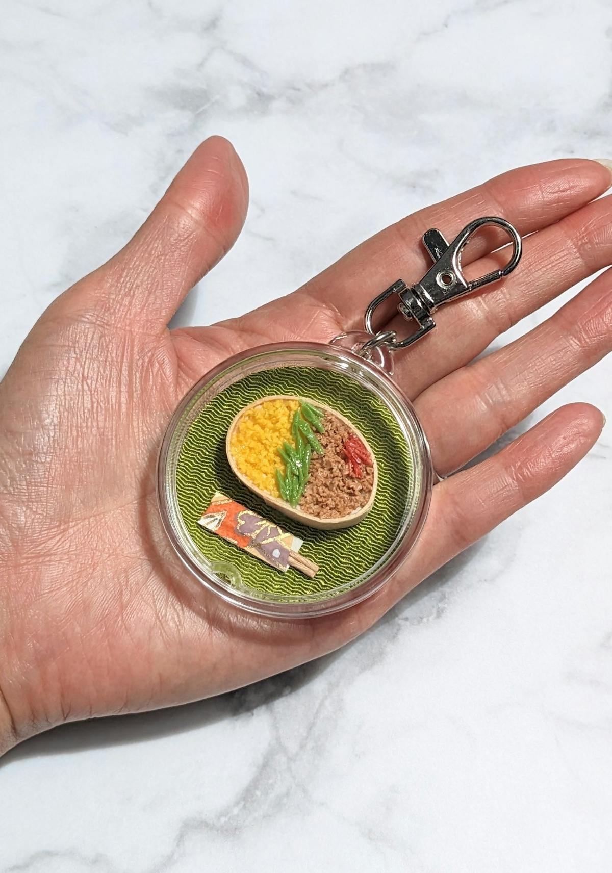 丸いクリアケースの中に曲げわっぱそぼろ弁当が入ったキーホルダーです。