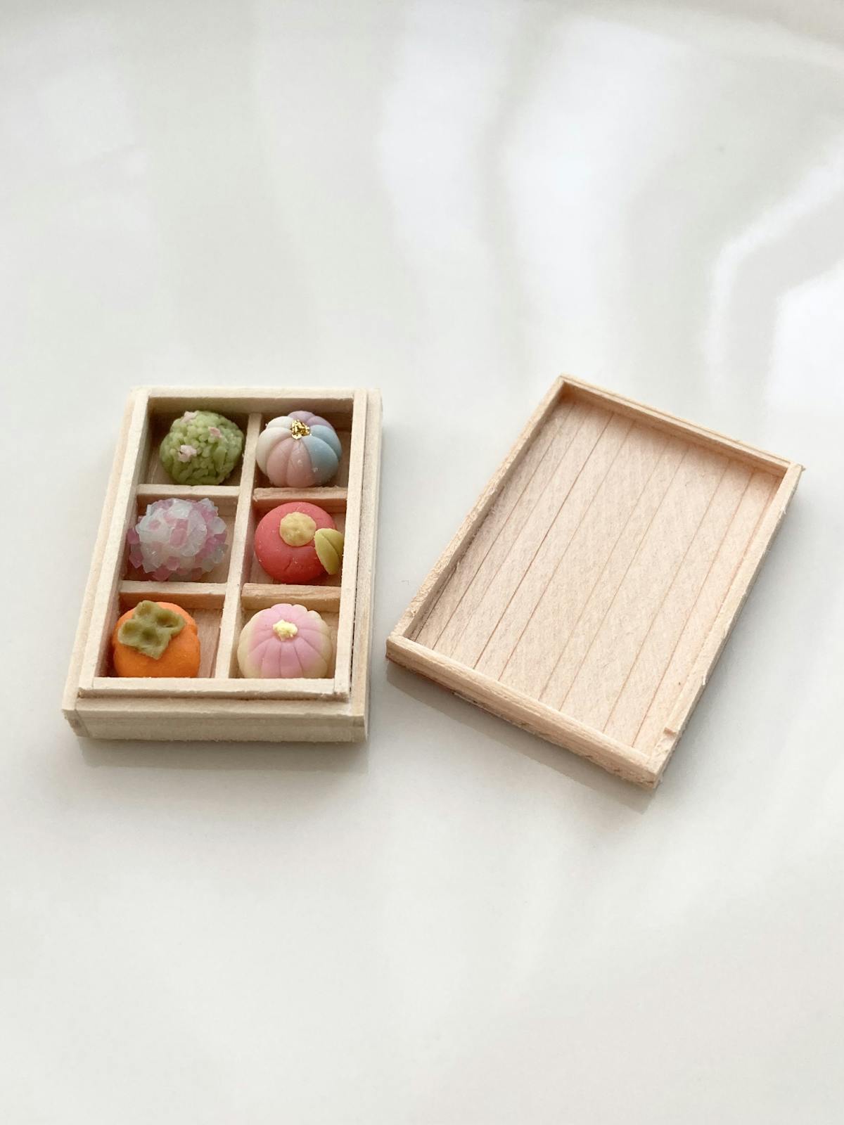 木箱と和菓子は接着しておりませんので、箱の中で並べ替えたり、お手持ちのミニチュア皿などに乗せてお楽しみください♪