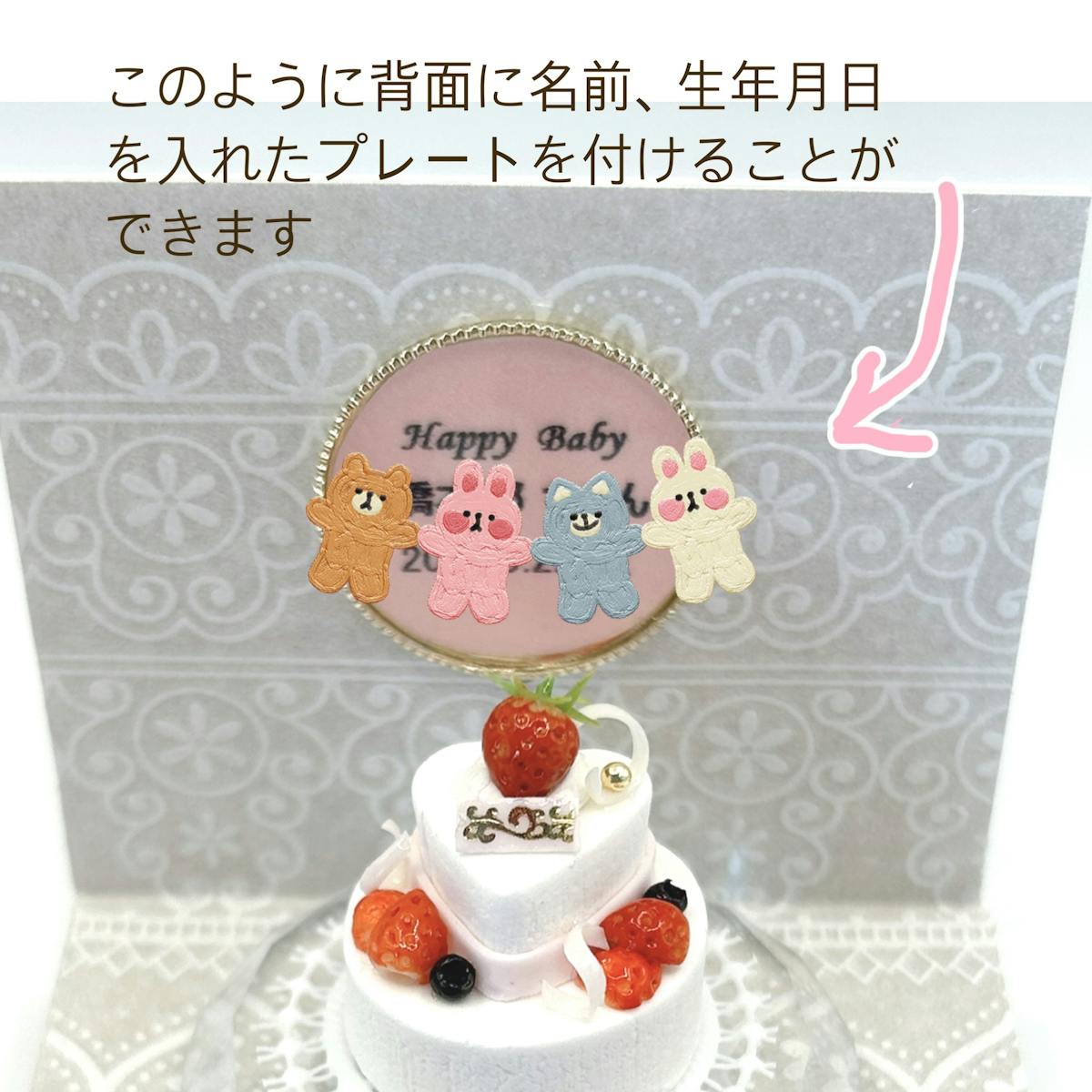 ご希望があれば、赤ちゃんの名前、生年月日を入れたプレートを作成し、背面に付けることができます。