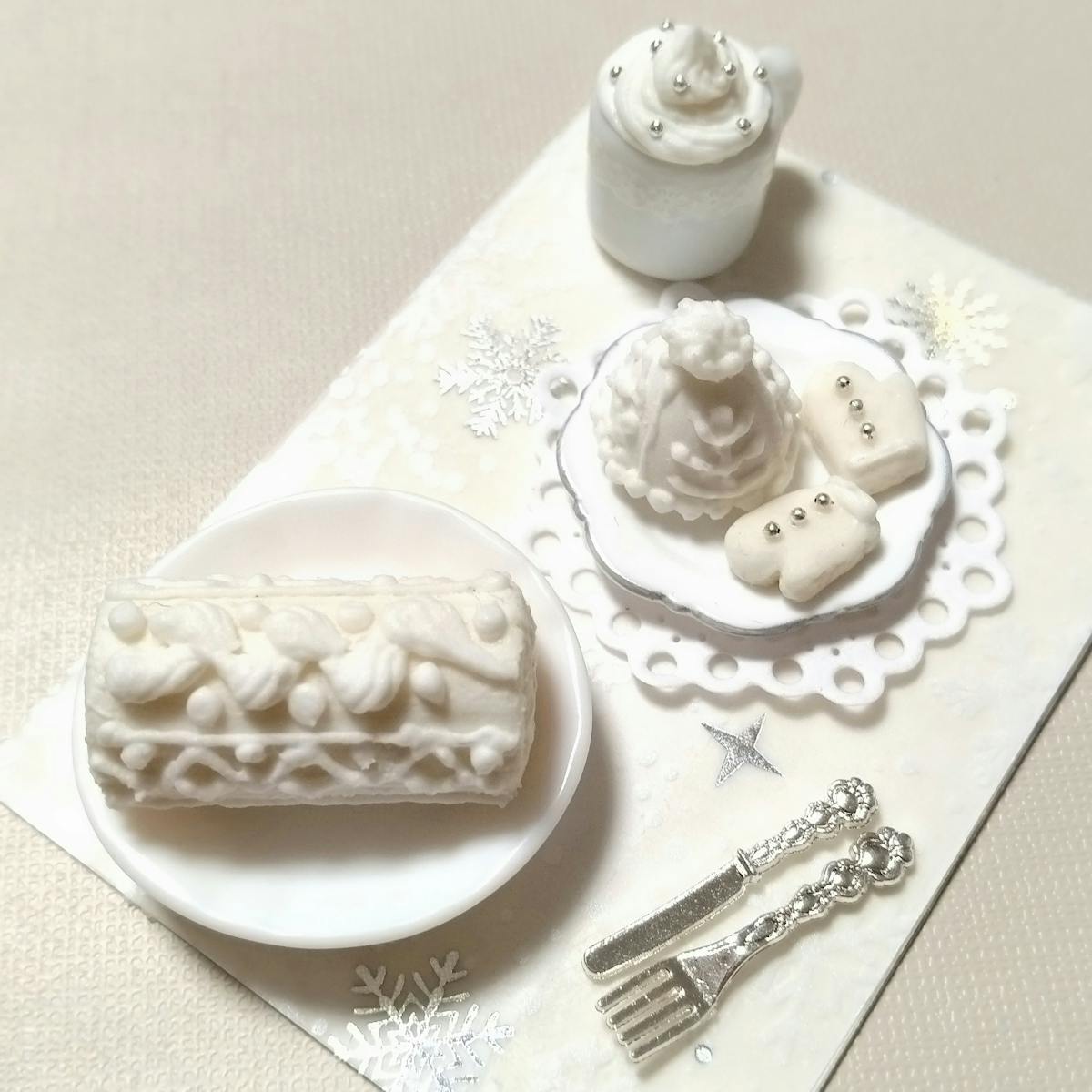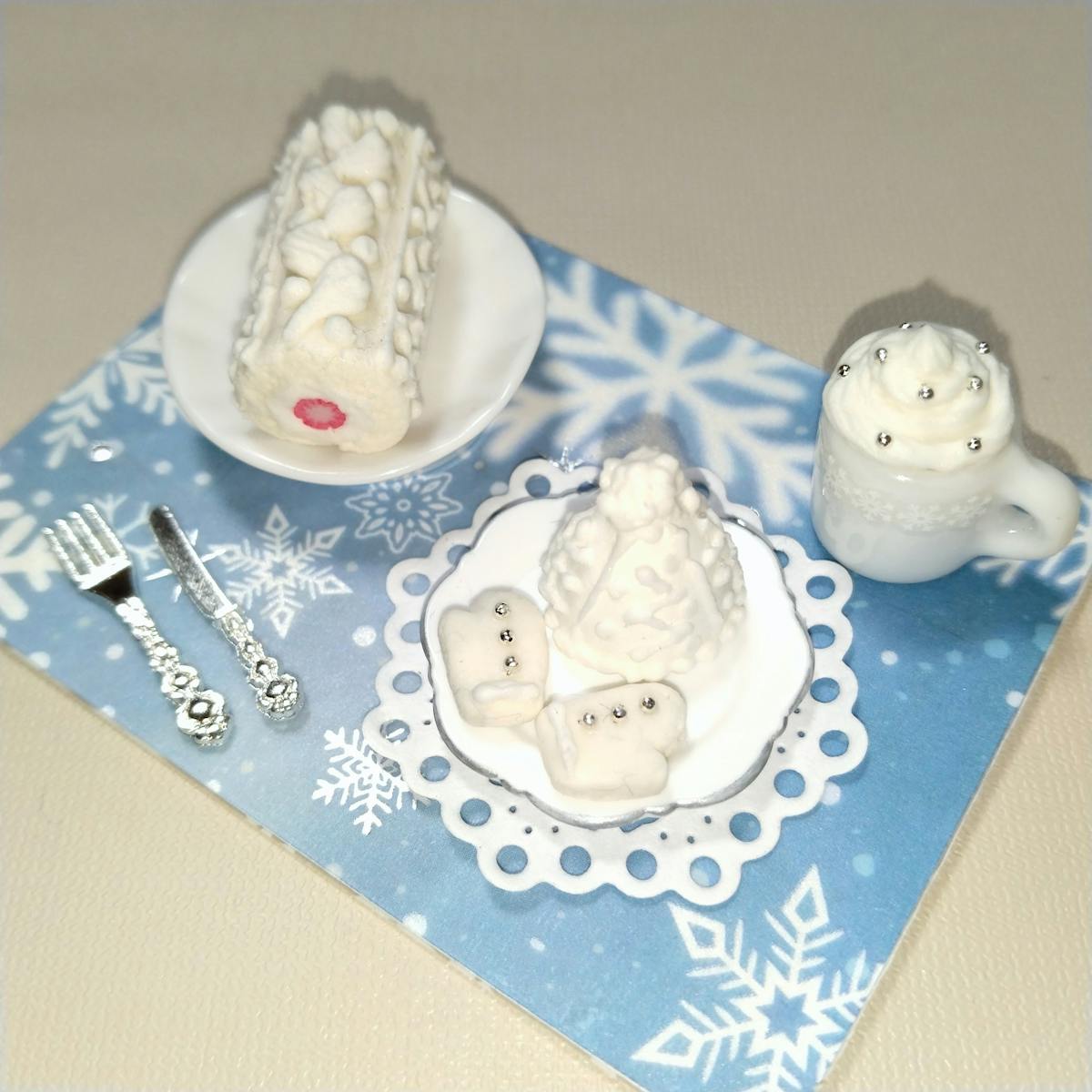 シートには未接着ですが、ロールケーキとお皿、ニット帽ケーキとアイシングクッキーは接着しています。