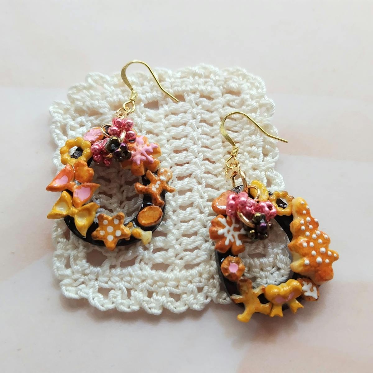ウッドパーツをクリスマスリースに見立てて、クリスマス柄のクッキーをモリモリにのせました。ウッドなのでとても軽いです。